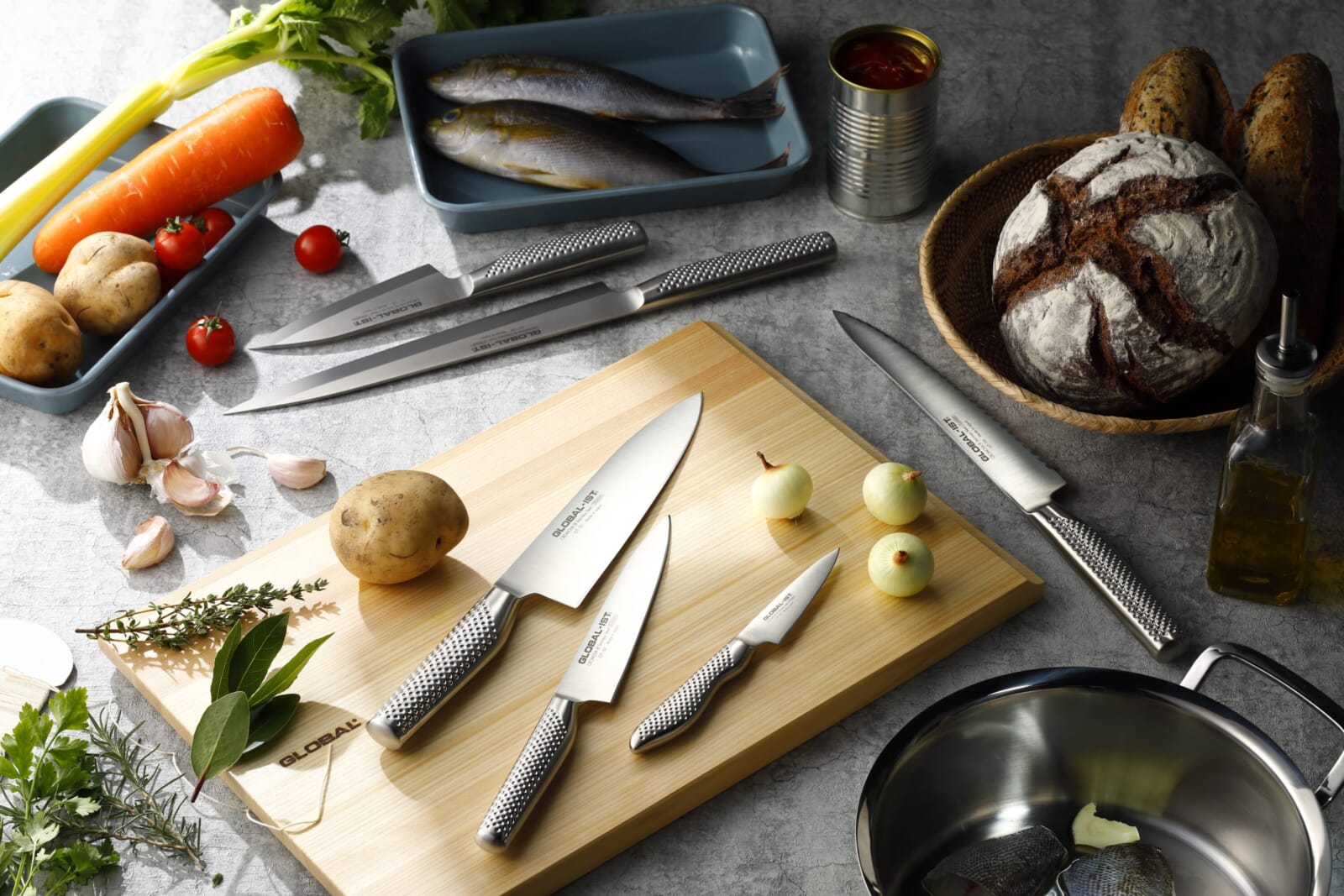 Yoshikin crafts metal tools that combine professional performance with thoughtful domestic design. Their Global-ist series, designed specifically for Japanese home kitchens, features finely sharpened, straight-edged knives that glide through ingredients for clean, precise cuts. From small paring knives to larger utility and bread knives, each piece balances industrial reliability with understated elegance, making everyday cooking a precise and satisfying experience.