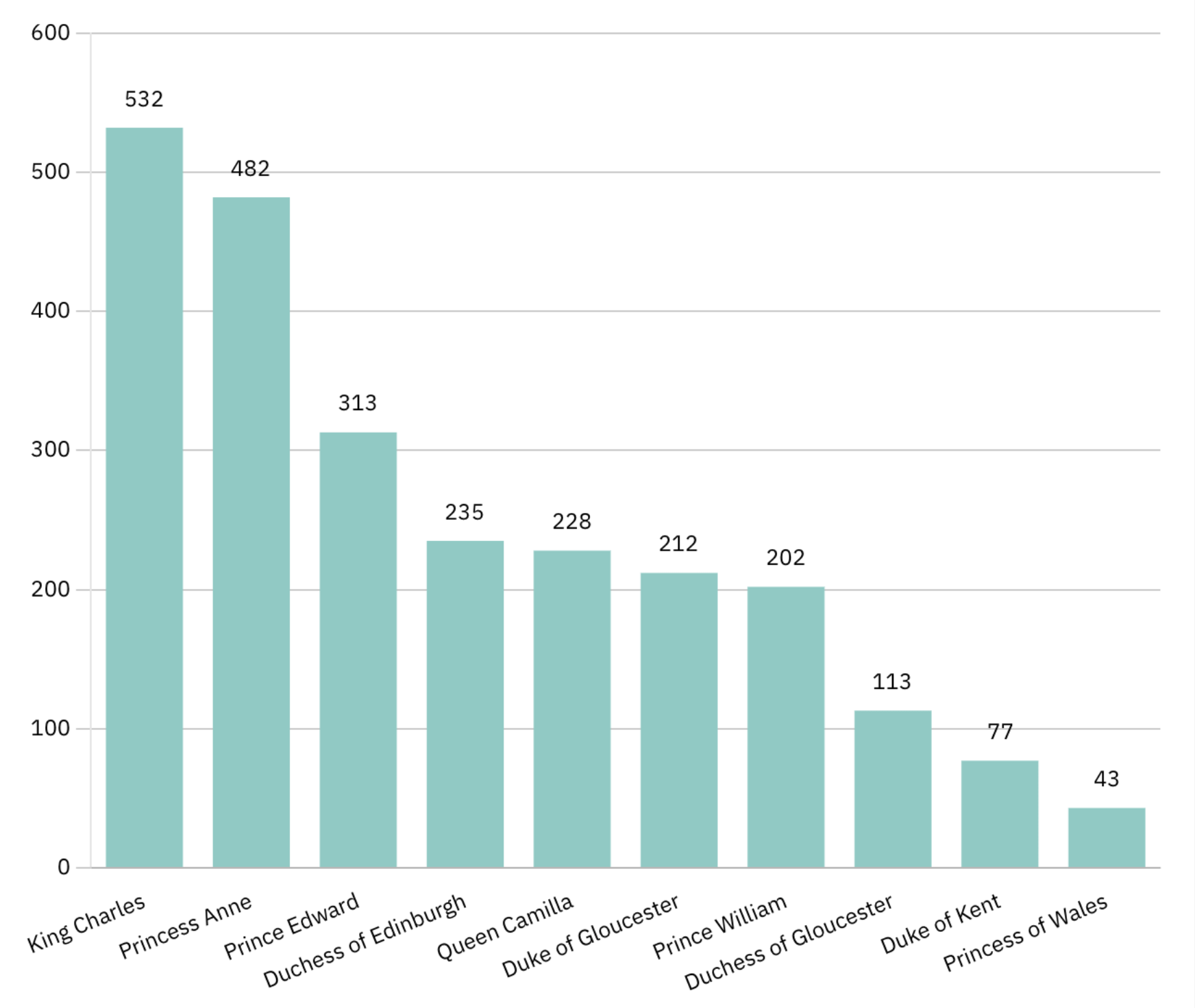 16. Part of why Charles and Anne have the highest numbers is because they also have the most patronages as befitting their seniority in the royal family. The numbers quickly add up when you have hundreds of patronages you’re meeting regularly. A quick Google search shows Charles apparently has 600+ patronages, and Anne has 300+. In contrast, William has about 30 and Kate has around 20.