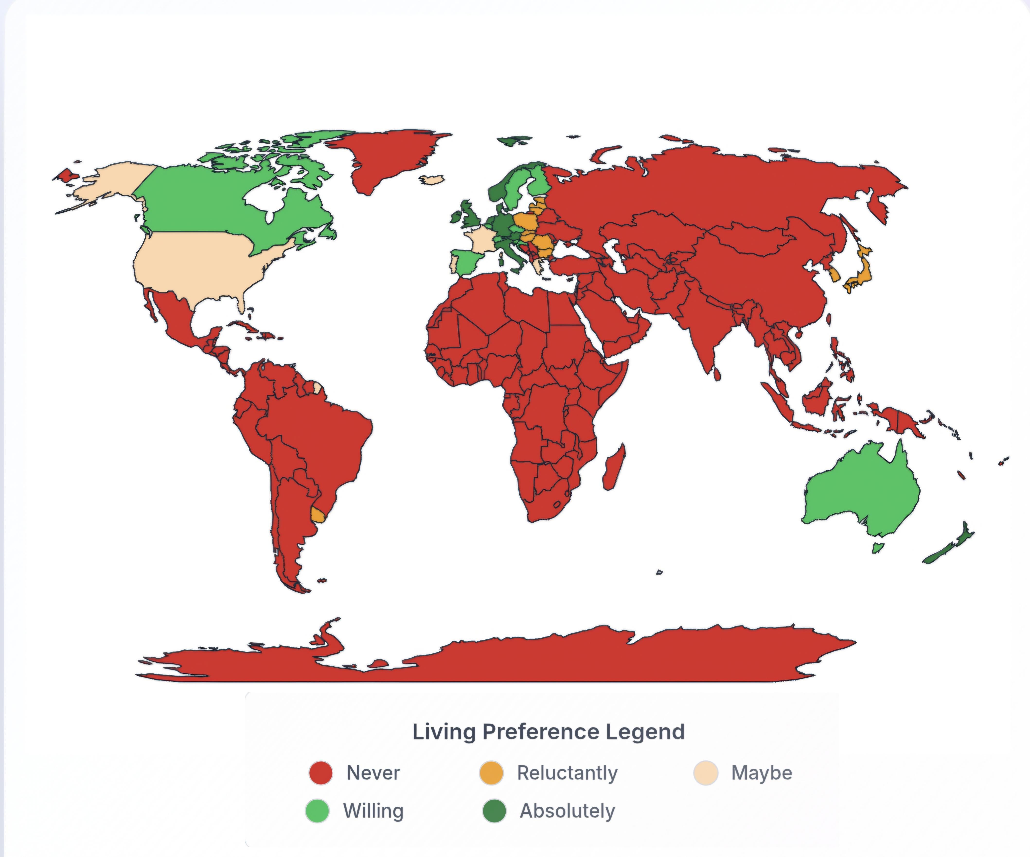 Živjel u USA, nebi više. Živjel 4 godine u Dubaiu, nebi ni mrtav više. Živjel na Filipinima i Hong Kongu, bilo kul. Sad u Njemačkoj, bilo kul sad više nije, možda se vratim i Hong Kong ili odem u Singapur