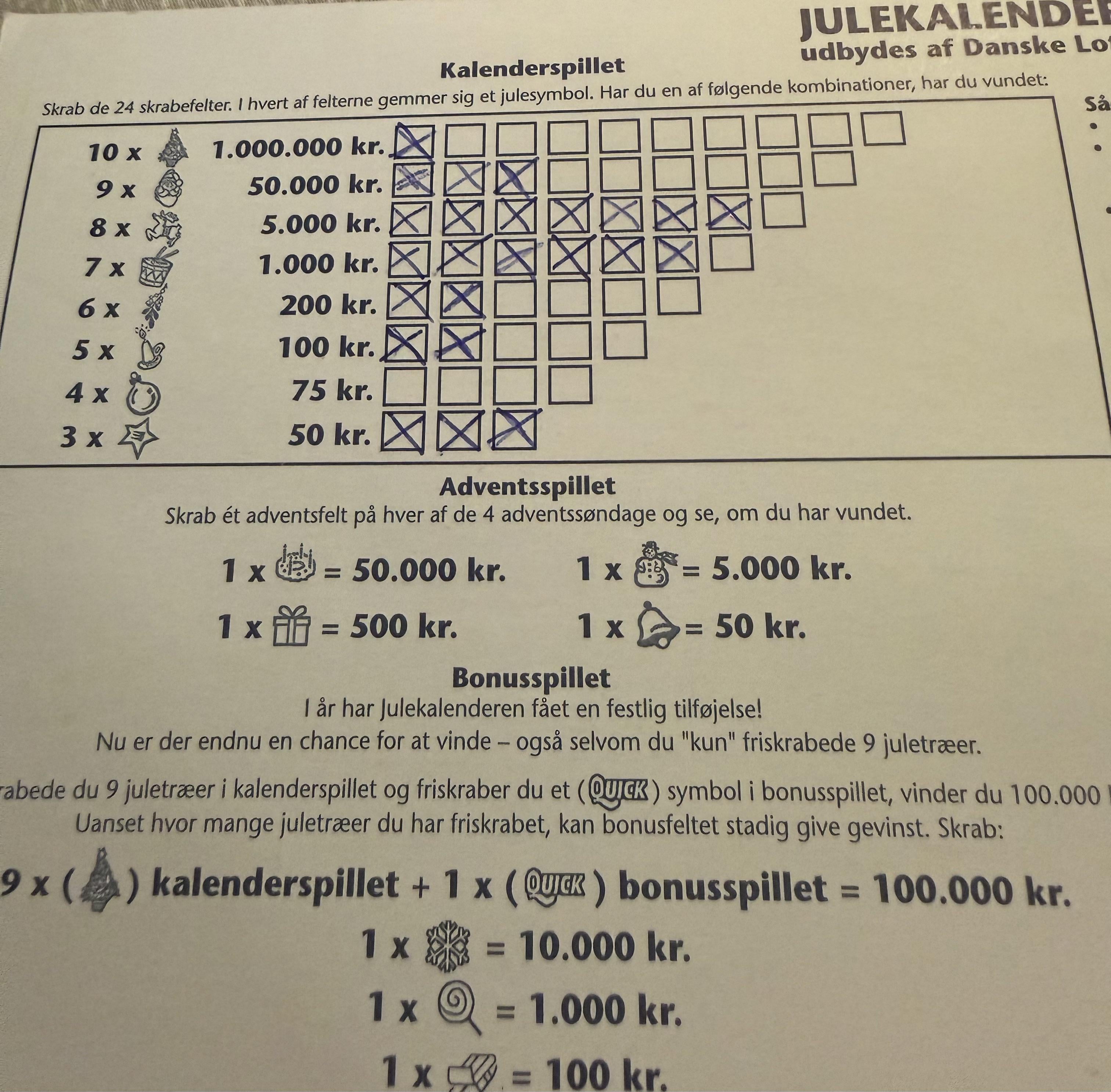 50 kr. er en fin præmie. Jeg har lige skrabet 8 stk. på [www.skrabejulekalender-simulator.dk/](http://www.skrabejulekalender-simulator.dk/) uden at vinde.