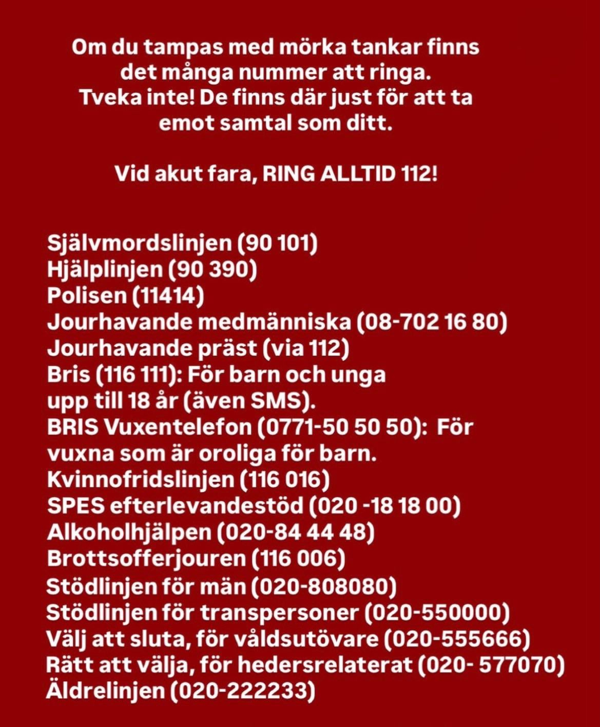 Var inte rädd för att be om hjälp om du behöver det. Vet ni med er att ni har nån vän eller släkt som sitter själv över jul, ring och önska dom god jul! Ta hand om varandra.
