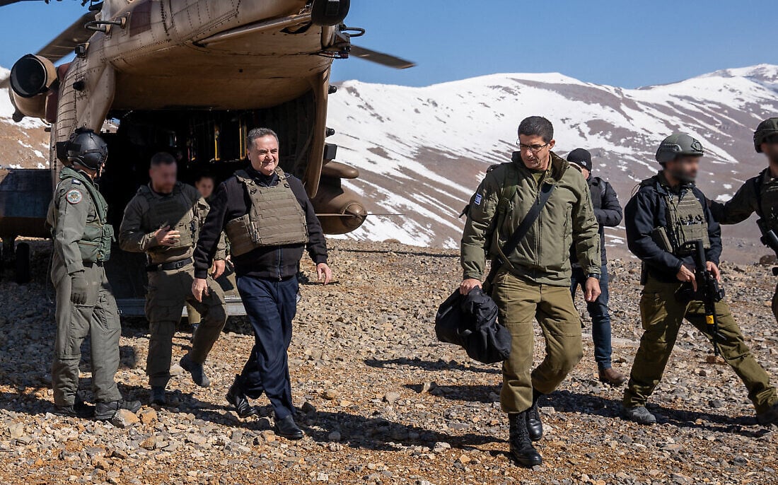 Defense Minister Israel Katz (left) and his military secretary, Brig. Gen. Guy Markizeno get off an Israeli Air Force helicopter in the Mount Hermon area in southern Syria, March 11, 2025. (Emanuel Fabian/Times of Israel)