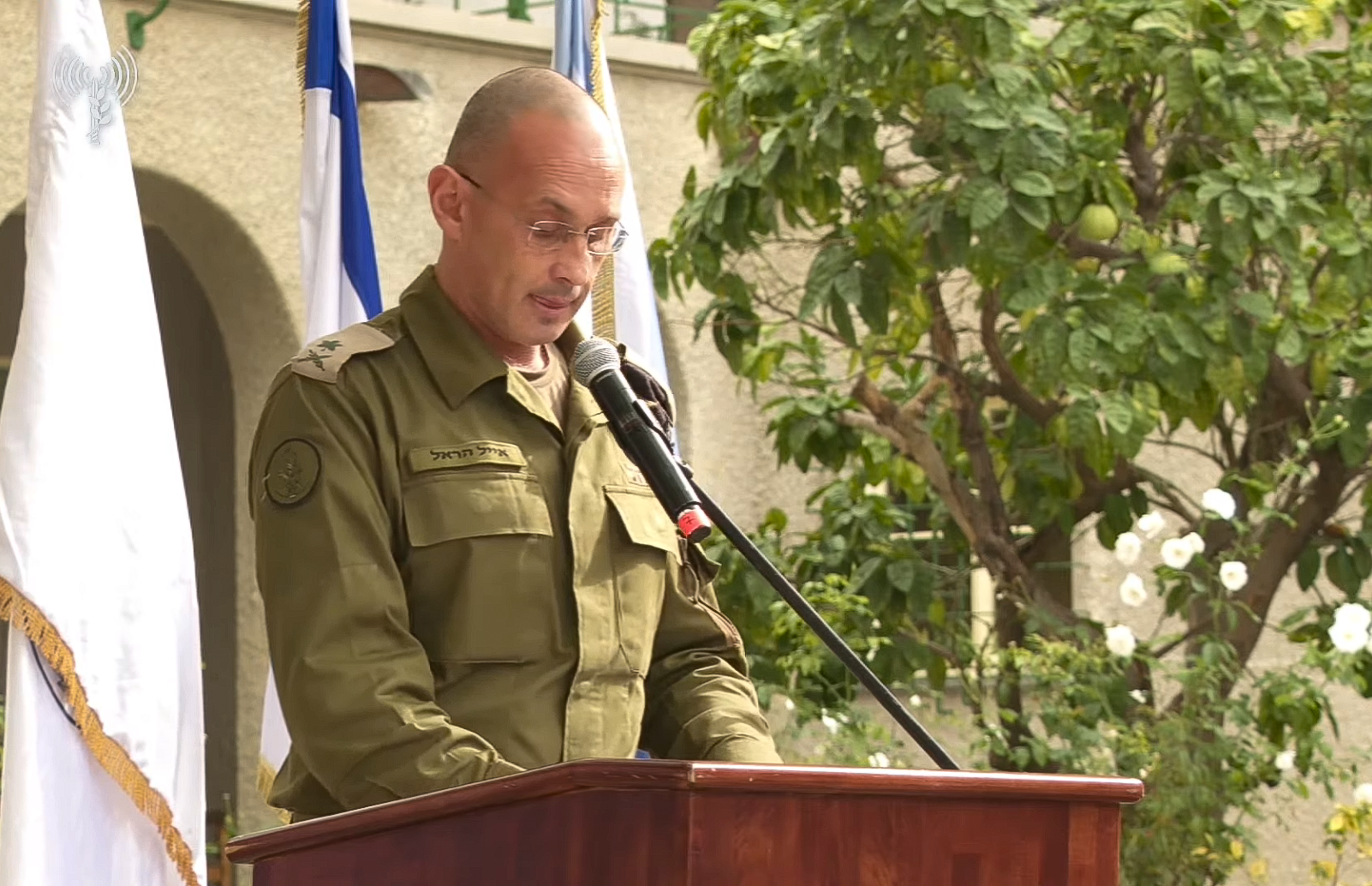 Vice Adm. Eyal Harel, the outgoing chief of the IDF Planning Directorate, speaks at a handover ceremony at IDF headquarters in Tel Aviv, December 21, 2025. (Screenshot: Israel Defense Forces)