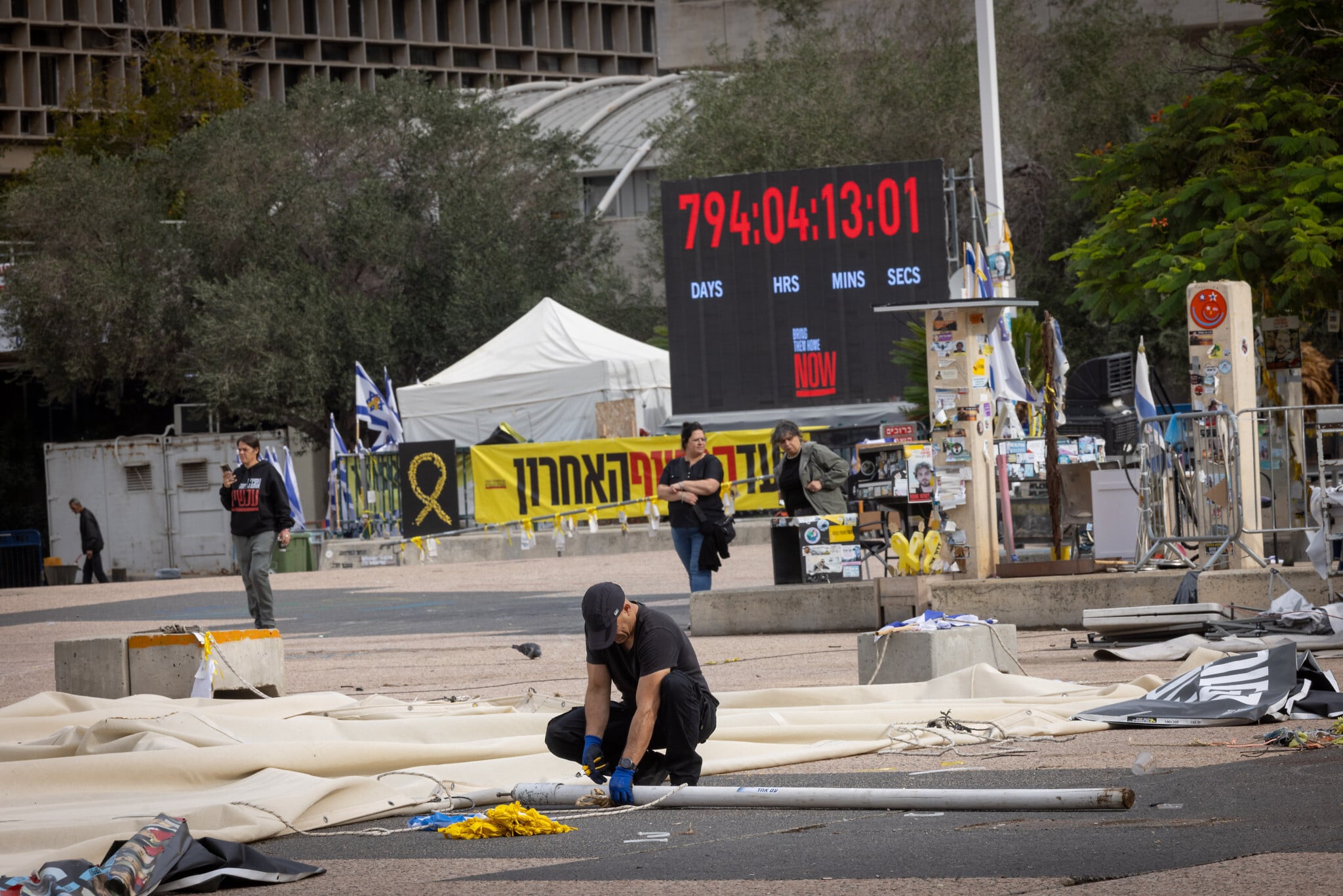 Workers dismantle installations at Hostage Square in Tel Aviv on December 9, 2025. (Miriam Alster/Flash90)