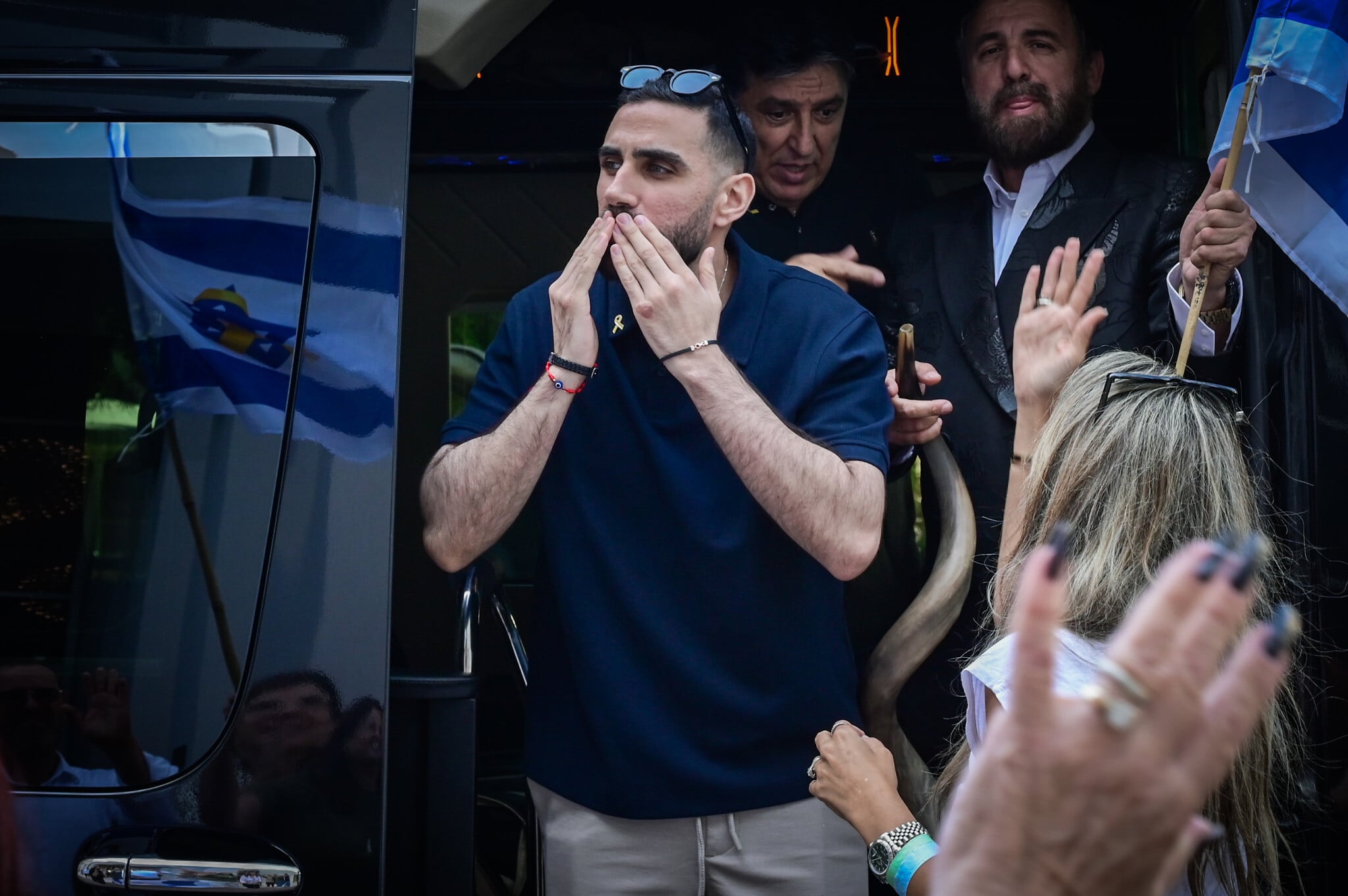 Freed hostage Segev Kalfon is released to his home from Kfar Maccabiah in Ramat Gan, October 26, 2025. (Avshalom Sassoni/Flash90)