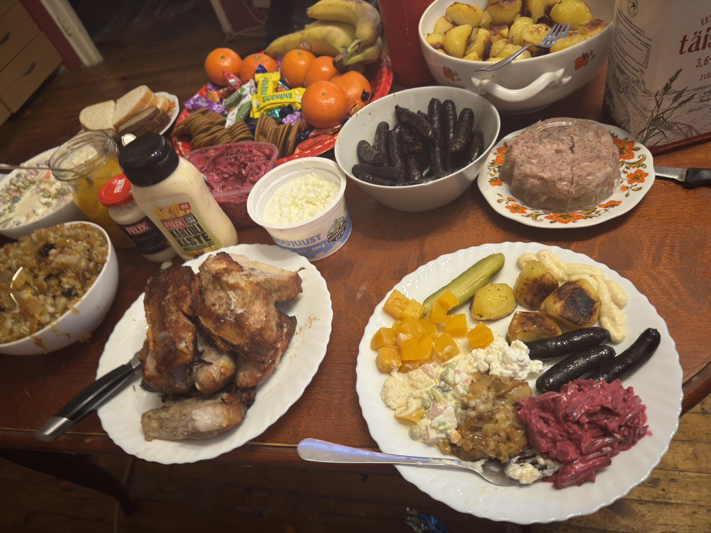 Tavaline: kartul, sealiha, verivorstid, liha kupsetamisest vedelik + hapukoor kastmeks ja hapukapsas. Valikus veel ka: singirullid, characaturie, dipivaagen, täidetud šampinjonid, kartulisalat, lõheviilud ja sai/leib. Magusaks kodus küpsetatud kaneeli šokolaadi kringel ja toorjuustukook. Joogiks morss(tavaline punane ja limpa siirupiga), Limpa limonaad, viin, gin, tonic, mahl, cosmopolitan,