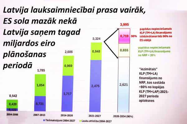 Jāpiebilst arī tas, ka solījumi un prasījumi neatrodas tikai vienā plaknē jeb ES 2021.-2027. gada plānošanas perioda šablonos. EK bremzē izdevumu pieaugumu esošajos izdevumu posteņos arī tāpēc, lai izbrīvētu naudu jauniem izdevumu posteņiem, kas padarīšot ES sevišķi progresīvu, tehnoloģiski attīstītu, militāri aizsargātu utt. Dažos gadījumos tas varētu nozīmēt, ka pašreiz lauksaimniecības atbalsta sadaļā saņemamu naudu Latvija varētu turpināt saņemt par vides daudzveidības saglabāšanu vai lauksaimniecības produktu pārstrādi pasaulē vēl nebijušos veidos. Citiem vārdiem sakot, ES 2028.-2034. gada plānošanas perioda naudas dalīšana pagaidām daudzos aspektos vēl mākoņstumdīšanas līmenī, taču nekādas priecīgas ainas šajos mākoņos nav saskatāmas.