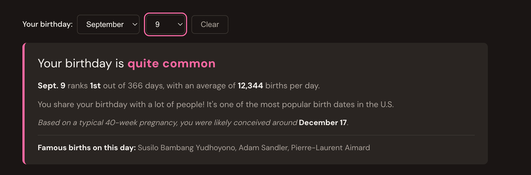 I always found it funny that I never met anyone with the same birthday as me. It wasn’t until my 24th bday that I finally did, so I was curious how common it is. Turns out it’s literally the most common day. WTF where were they all hiding?!