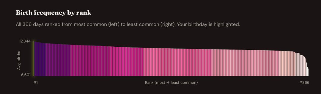 Back in the early 2010s, I made a static heatmap showing birthday popularity that got picked up widely – it even made it into Best American Infographics. But the criticism was valid: I'd colored by rank, not actual birth counts, which exaggerated the differences between dates.