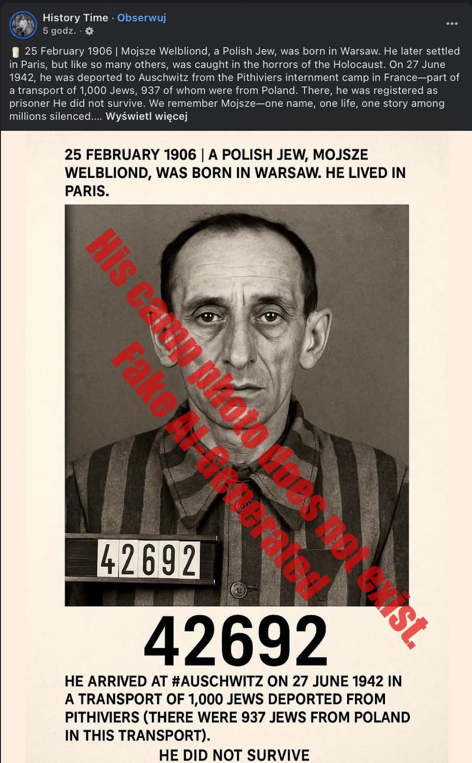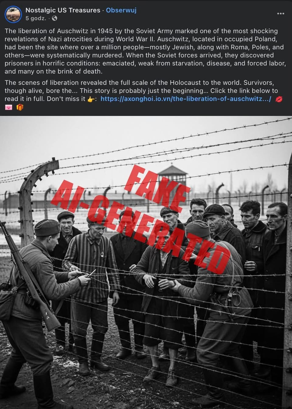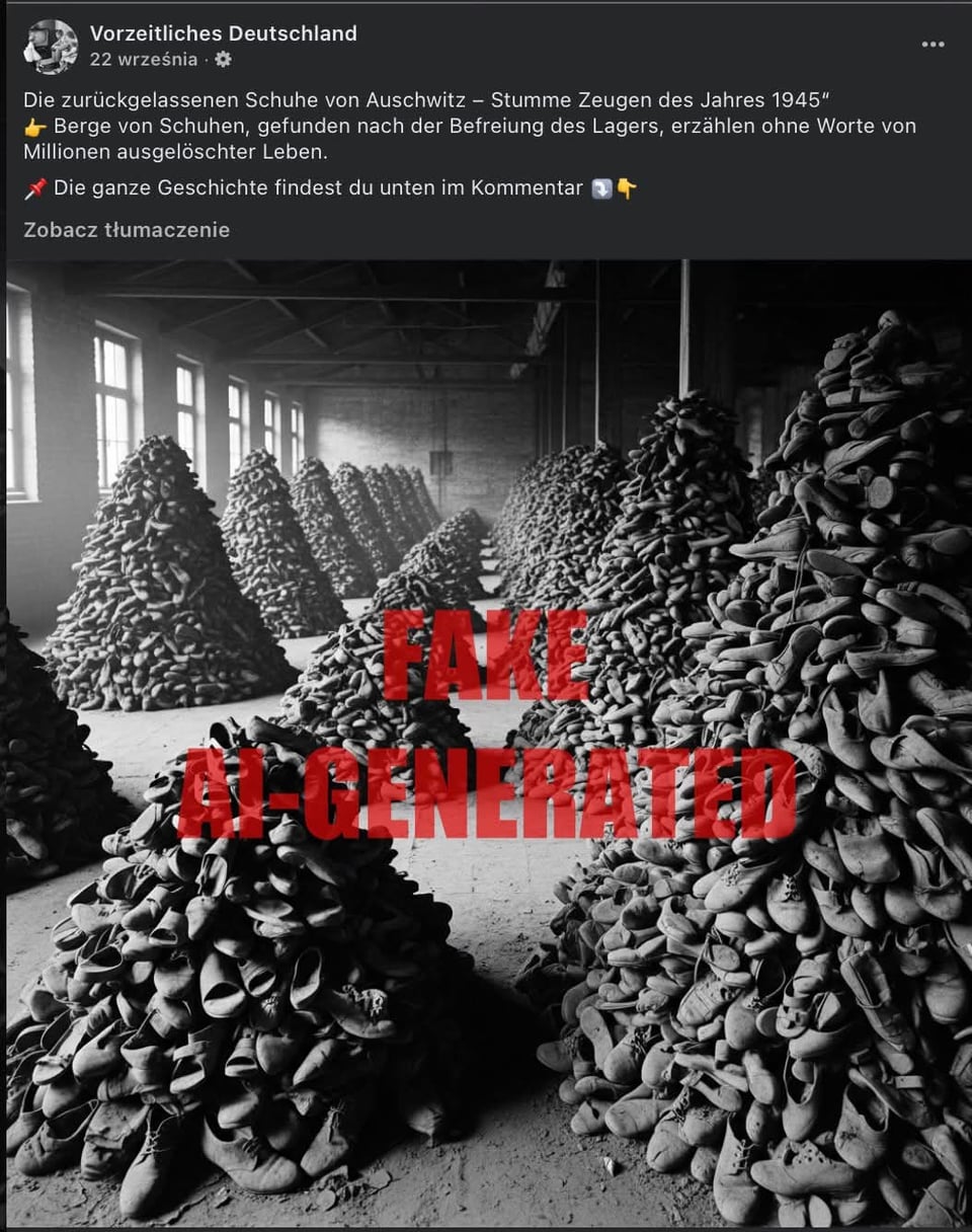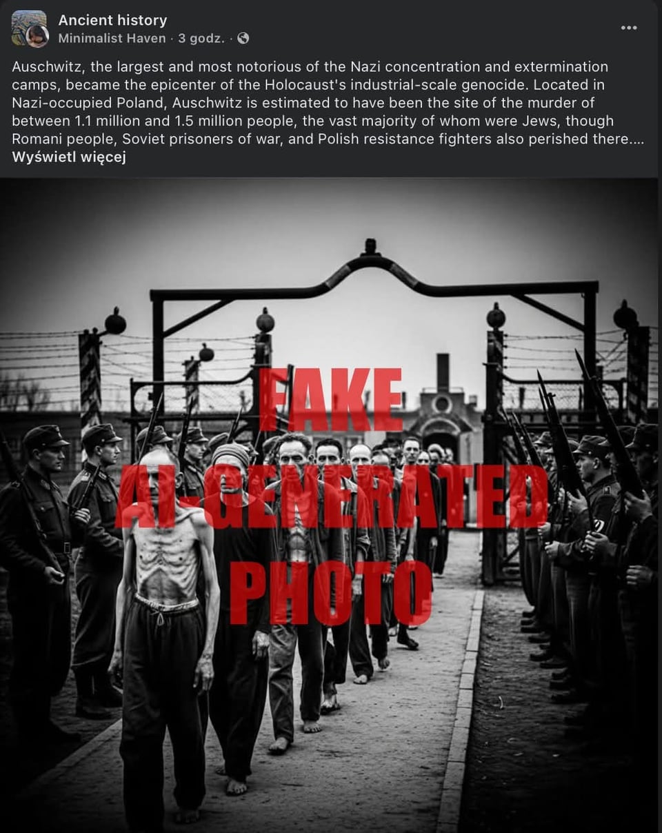 debilní je, že existuje plno skutečných materiálů, ale dost lidí táhne na takový ty správně smutný obrázky, třeba portréty ženských oběti jsou hezčí a mladší, muži mají řezanější tváře, fotky ostrý… často to ani nedává smysl, post o transportu? yes, dáme tam normální vlak a ne dobytčák, i když se pro tenhle konkrétní transport používal, post o knězích v odboji? bez vygenerovanýho videjka, kde muži šlapou v koncentráku do schodů v civilních hadrech, to nedává smysl apod.