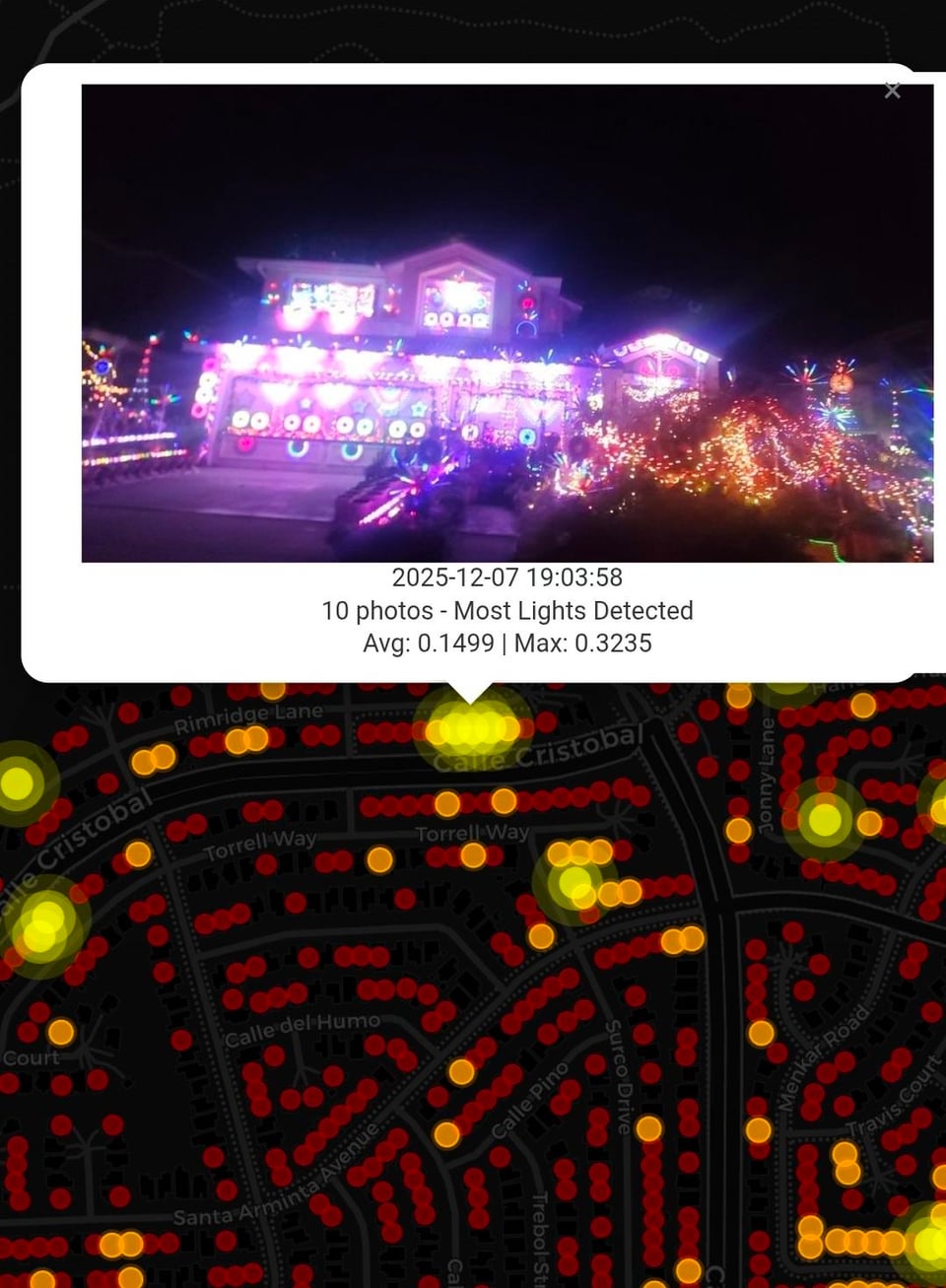 Interesting, but it seems like you need a way to differentiate between holiday lights and just regular lights. A lot of the red dots seem to just be street lights or porch light. Also some of the yellow dots seem to just be bleed over from an adjacent house?Â