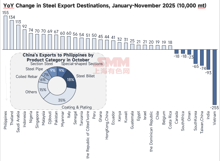According to data from the General Administration of Customs compiled by SMM, China’s cumulative steel exports from January to November 2025 totaled 121.1127 million mt, up 13.32% YoY. By country, the Philippines remained the largest contributor to the cumulative YoY increase, with exports rising by 1.5523 million mt, a growth of 30.09%.