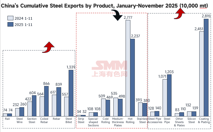 According to data compiled by SMM from the General Administration of Customs, China exported 11.4601 million mt of steel products in November 2025, including 2.1007 million mt of hot-rolled exports, up 215,900 mt MoM from October. The main reason was that Vietnam’s anti-dumping duties on wide coils from China are expected to take effect soon, prompting traders to actively rush shipments, leading to the overall increase. Consequently, the cumulative YoY decline narrowed to -19.5%. Meanwhile, most long products performed well, with the cumulative YoY growth rates for coiled rebar and rebar reaching 53.7% and 35.9%, respectively, second only to the 140.4% for steel billet.