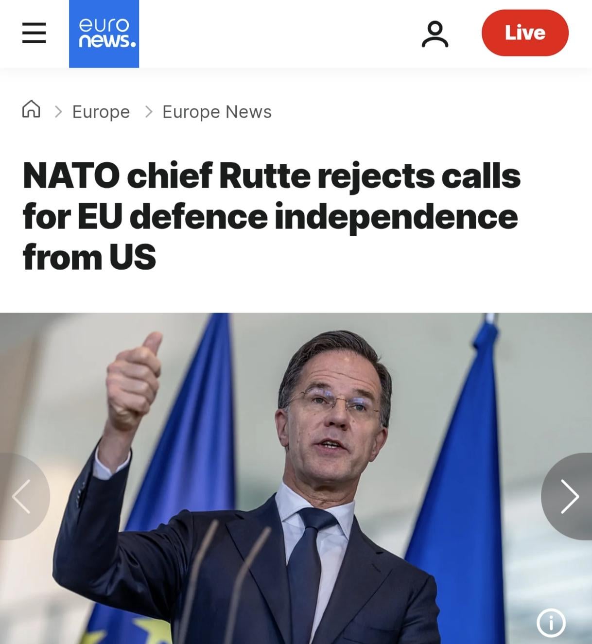 Rutte knows where the real defense spending and current power lies. If EU separates from the US then his job at NATO becomes much less important and of course he couldnt stand for that