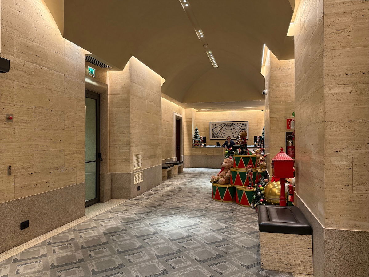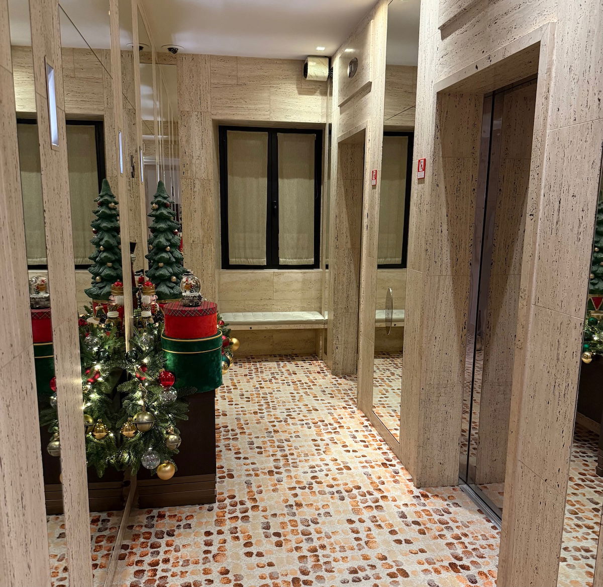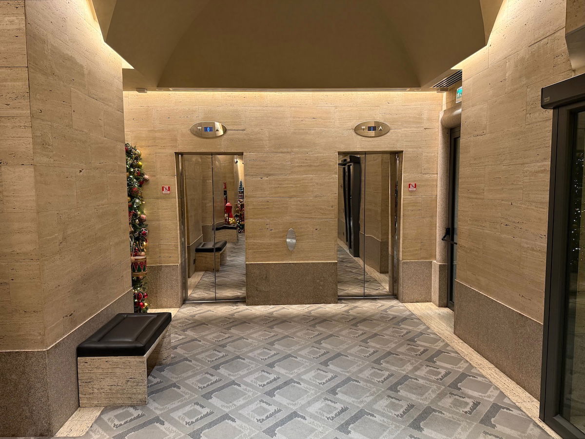 The Park Hyatt Milan has six floors, and my dad and I were both assigned junior suites on the fifth floor. Even the elevator area on each floor had Christmas decorations.
