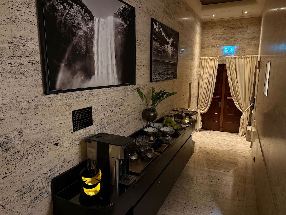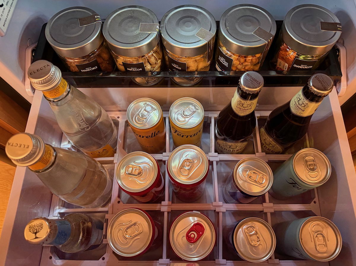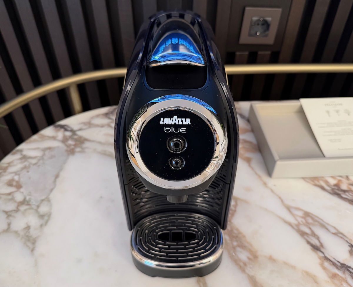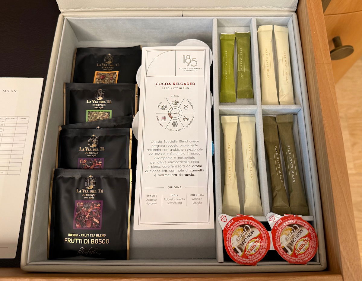 That console had a Lavazza coffee machine, a La Via del Tè tea selection, plus a minibar with snacks and drinks for purchase.