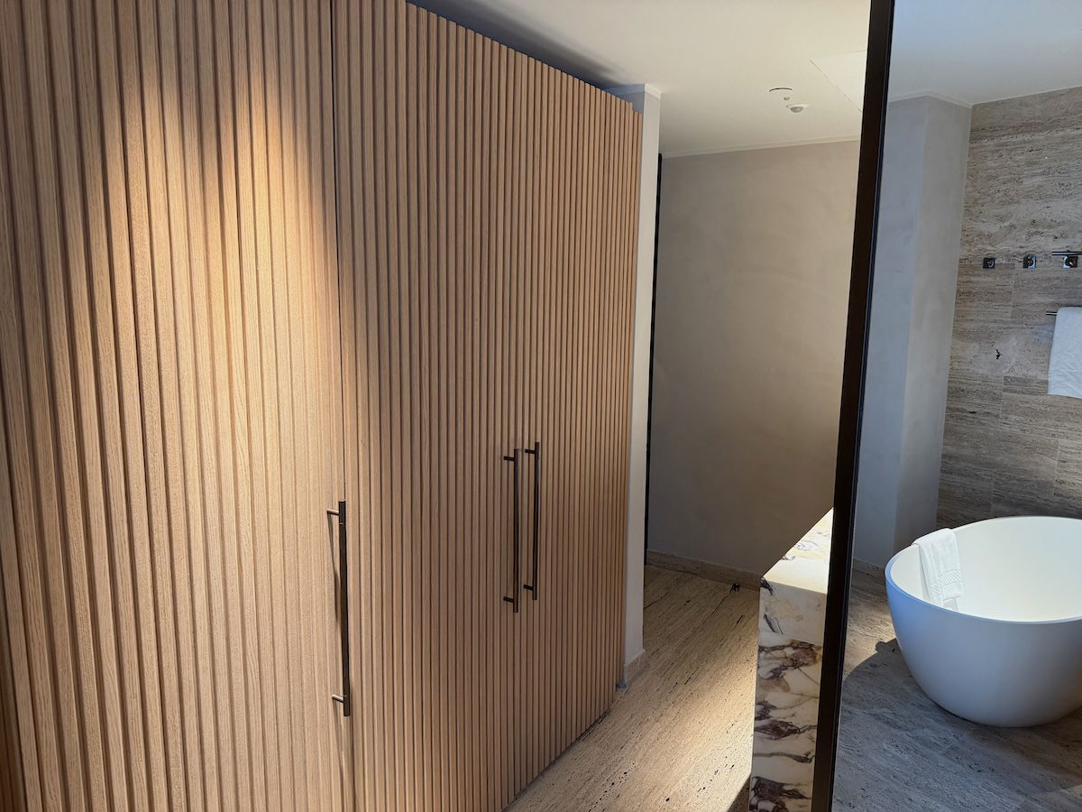 The bathroom was then on the opposite side of the living area, inside the entrance to the room and to the left. It was a fully separate room. As you entered, there were first double sinks, along with quite a bit of closet space.