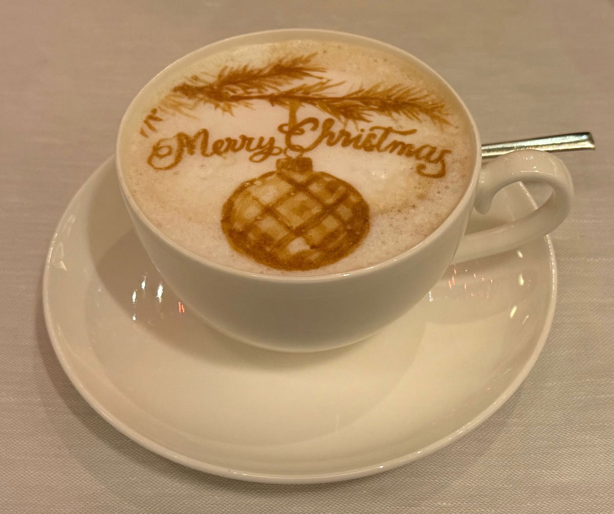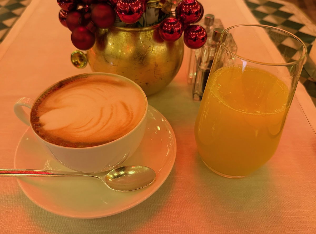 The barista-made cappuccino and freshly squeezed orange juice were excellent, and one of my cappuccinos even had Christmas “art” on it.