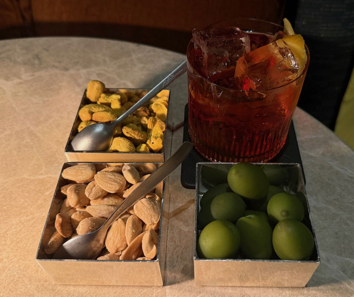 My dad and I had a pre-dinner drink here on our second evening (the first day I was too hungover from our Emirates flight to drink anything). I had a negroni, served with a trio of bar snacks.