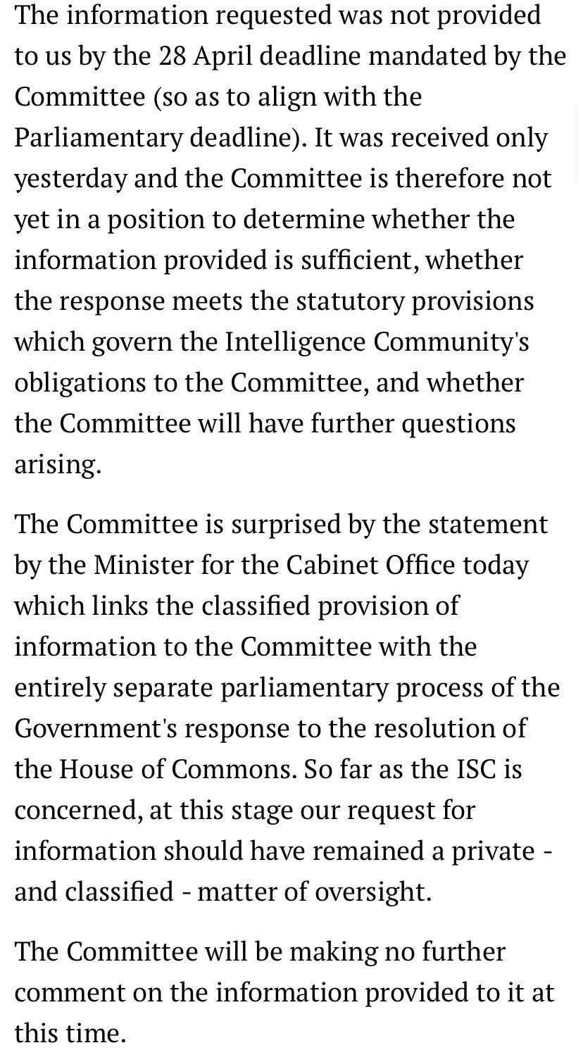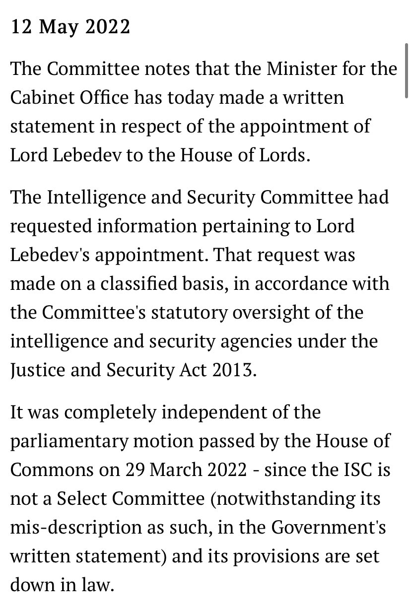 >The government today justified not releasing the security service advice Boris Johnson received about Evgeny Lebedev by saying they had handed confidential info to the Intelligence and Security Committee instead.