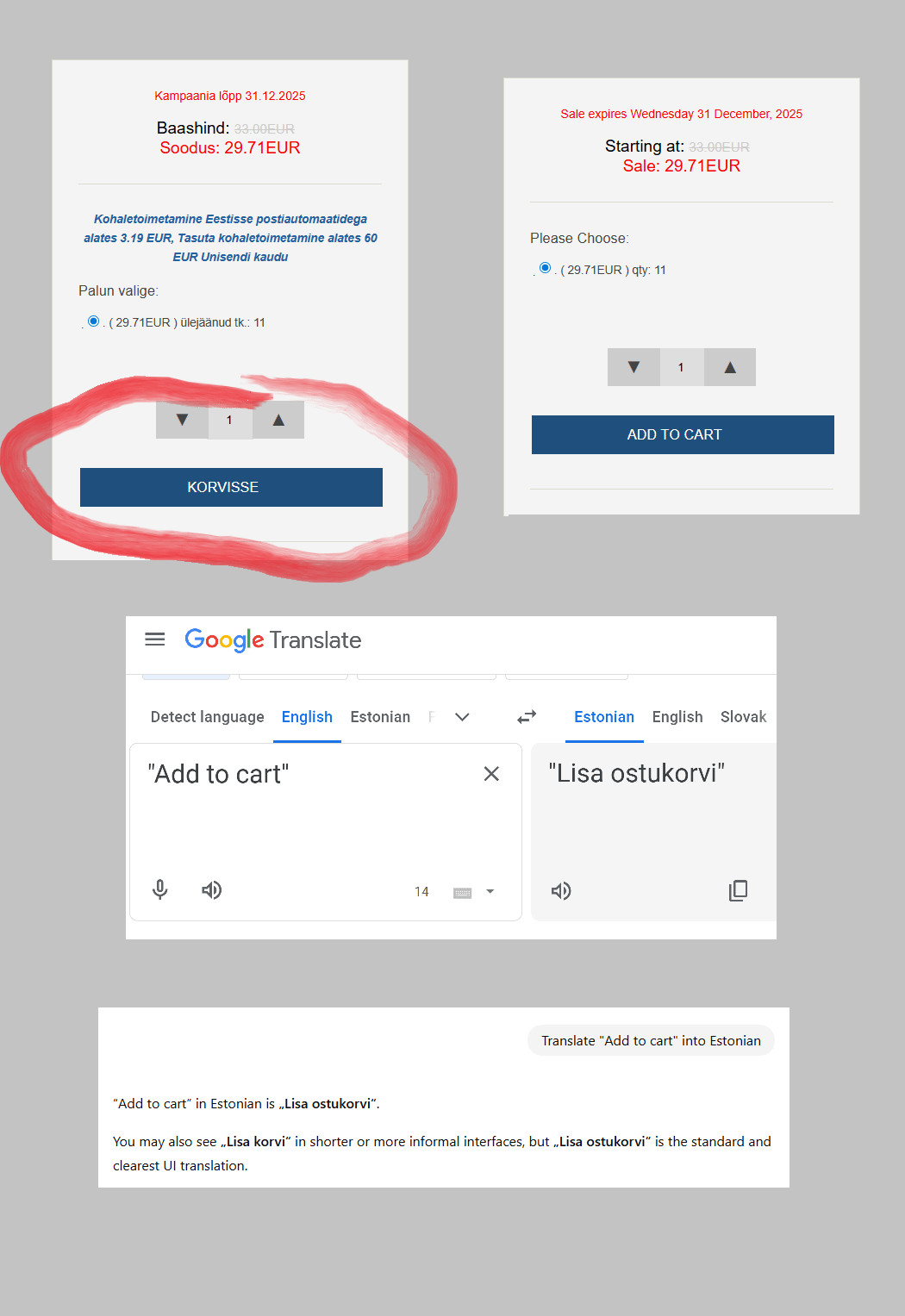Ega siis päriselt ühe välismaa e-poe kasutajaliides (millel iganes see jookseb) lives Google translate vastu ennast reaalajas valideeri. Kerge huumoriga võiks võtta nagu nt Samsungi pesumasina tsükli lõpp kuvab Samsungi televiisori ekraanile “30 minutit aevastus” (30 min snooze) teavituse valikusse.