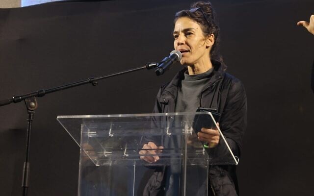 Meirav Svirsky, sister of slain hostage Itay Svirsky, speaks at an anti-government rally at Habima Square in Tel Aviv, December 27, 2025. (Marcelo Sznaidman / Pro-Democracy Protest Movement)