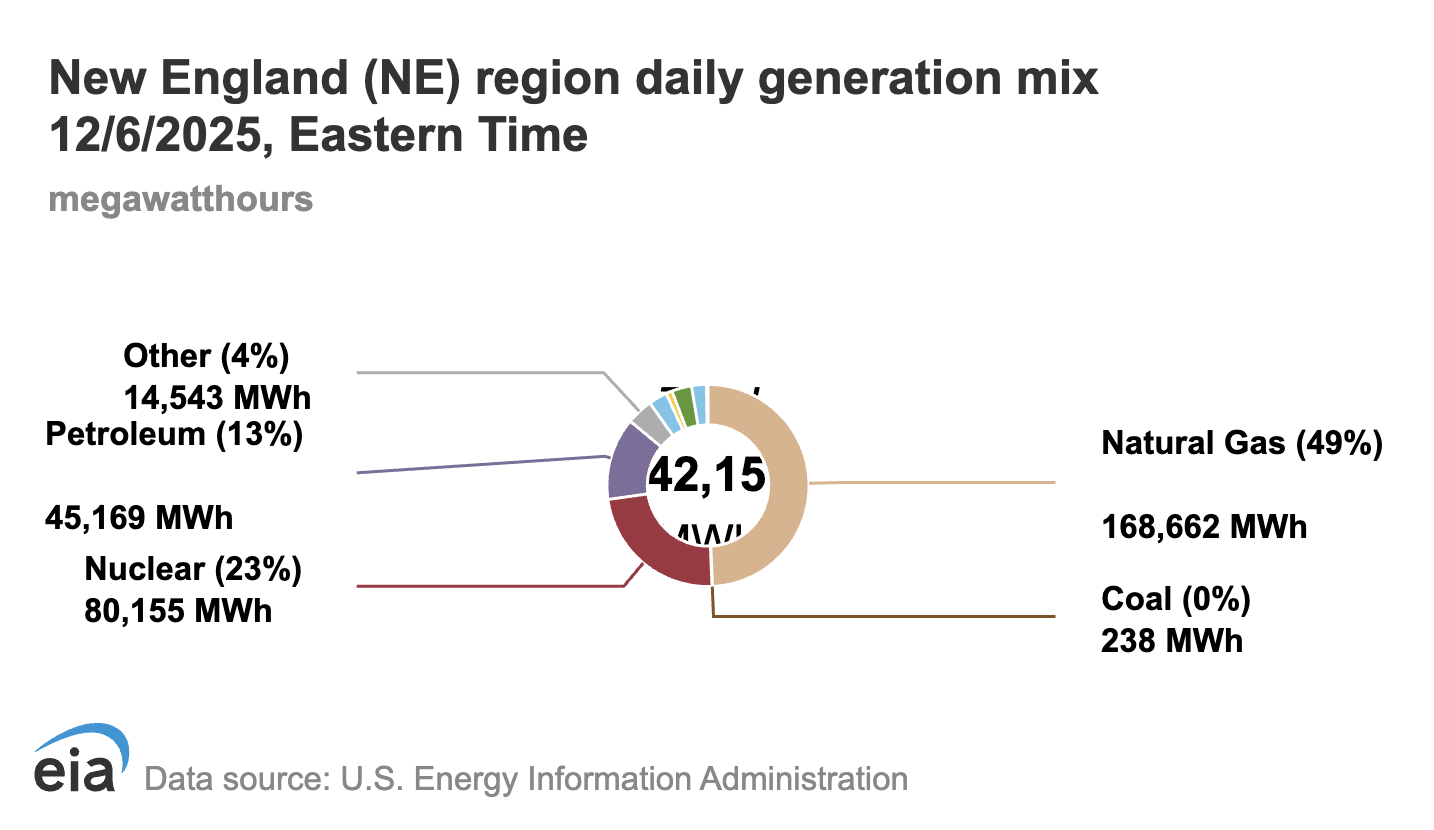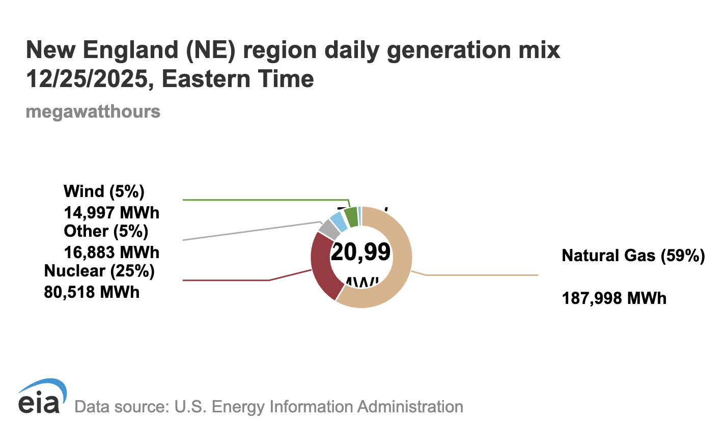 On Christmas Day, for example, natural gas and nuclear power alone provided 84 percent of the electricity on the ISO-New England grid. Wind accounted for just 5 percent, and solar about 1 percent.