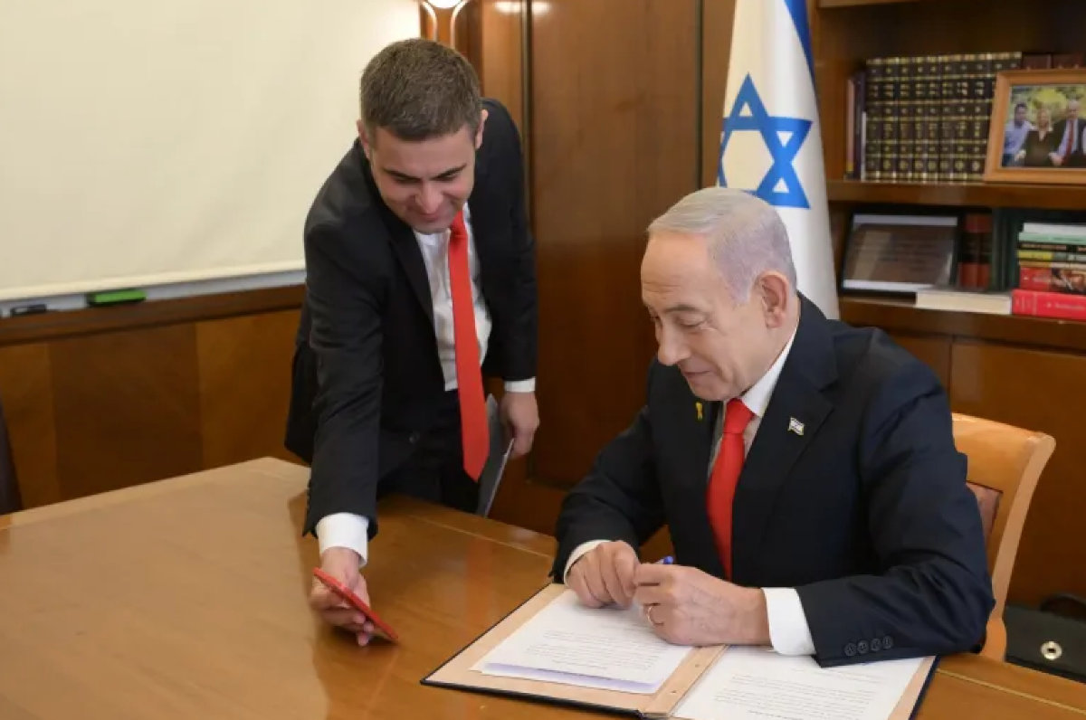 Israel’s Prime Minister Benjamin Netanyahu, assisted by Foreign Minister Gideon Sa’ar, signs the document formally recognizing Somalia’s breakaway Somaliland region on Dec. 26, 2025. (AFP)