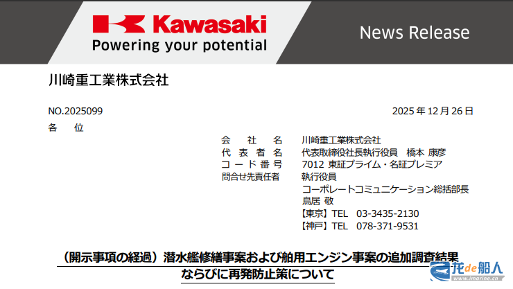 On December 26, the Japan Ministry of Defense issued an announcement regarding the Kawasaki Heavy Industries data falsification scandal: Kawasaki Heavy Industries will be barred from participating in bidding processes for a period of two and a half months, from December 26, 2025, to March 11, 2026. On the same day, Kawasaki Heavy Industries released a supplementary investigation report and follow-up preventive measures regarding the “submarine repair case and marine engine inspection falsification incident” (hereinafter referred to as the “Supplementary Investigation Report”), and apologized again for both scandals.