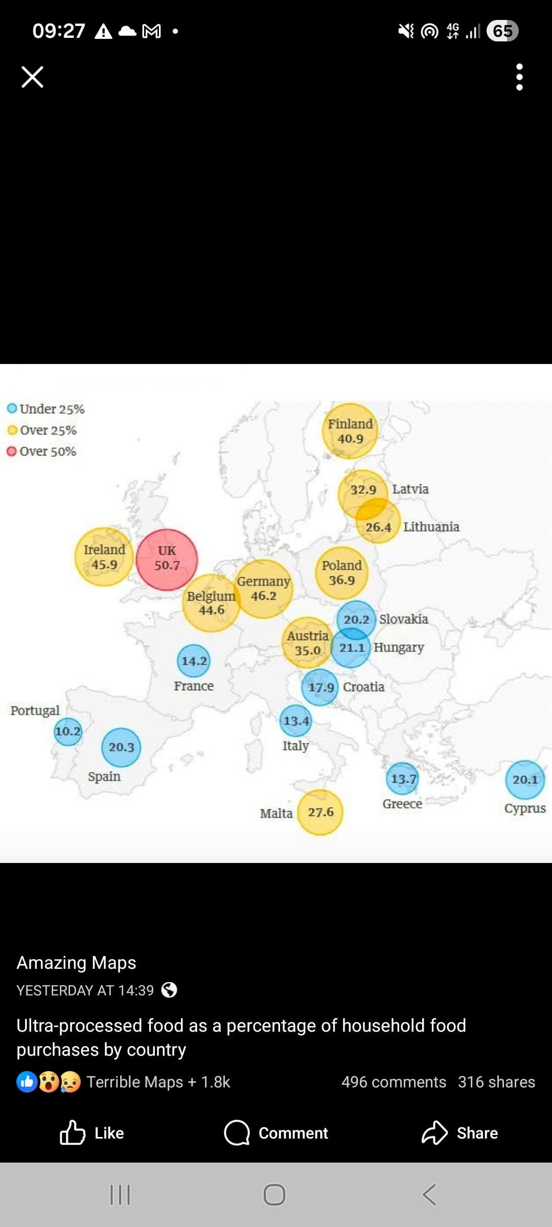 What exactly is meant with “ultra processed food” here? Also what is the source for the data visualized map? Most of those facebook posts are just AI generated slop that has no basis on anything.