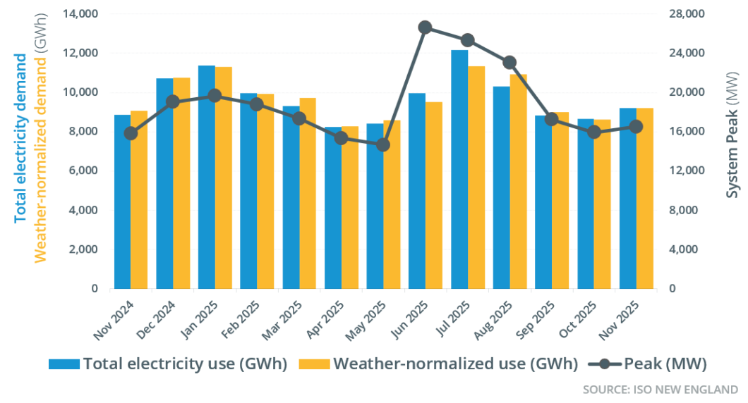 Consumer demand for electricity for the month peaked on Nov. 17 during the hour from 5 to 6 p.m., when the temperature in New England was 37°F and the dewpoint was 22°. Demand reached 16,526 MW. The November 2025 peak was 4.4% higher than the November 2024 peak of 15,837 MW, set during the hour from 5 to 6 p.m. on Nov. 26, when the temperature was 41°F and the dewpoint was 38°.