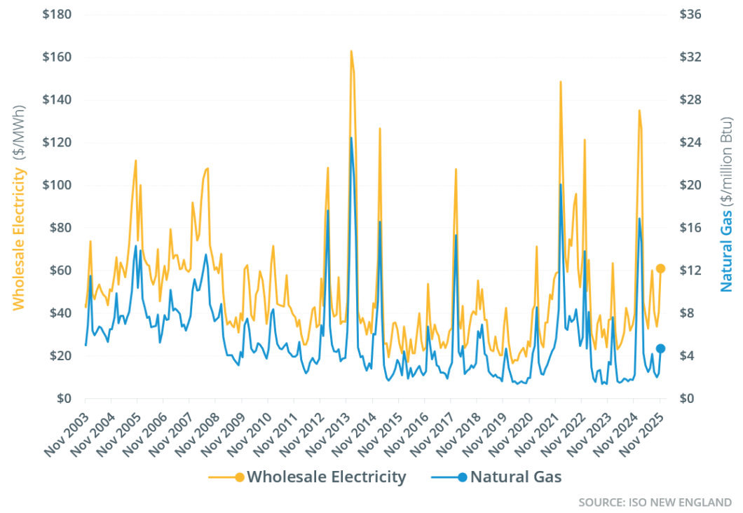 Fuel is typically one of the major input costs in producing electricity. Natural gas is the predominant fuel in New England, used to generate 55% of the power produced in 2024 by New England’s power plants, and natural-gas-fired power plants usually set the price of wholesale electricity in the region. As a result, average wholesale electricity prices are closely linked to natural gas prices.