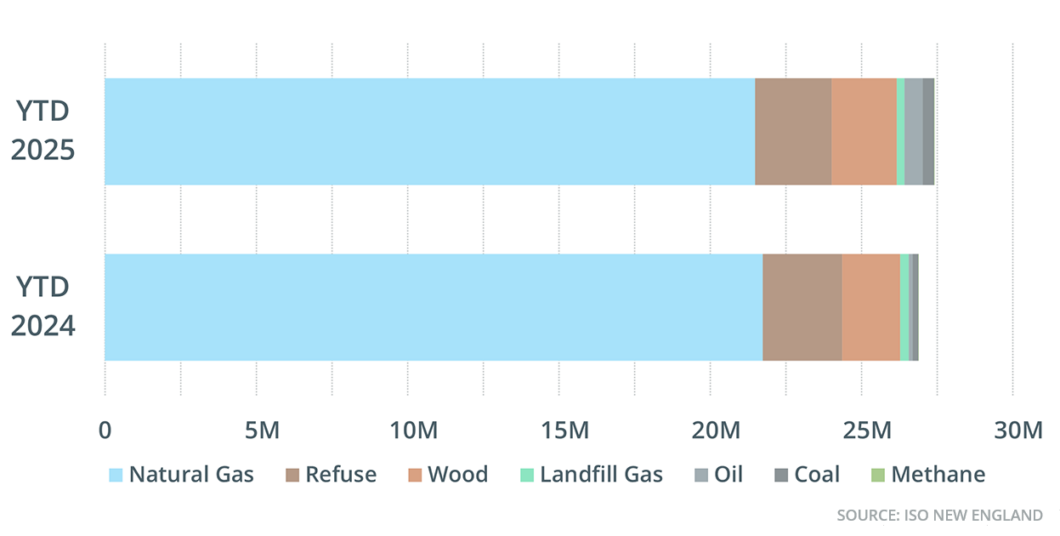 5. The factors used to calculate estimated CO2 emissions were updated in October 2025. ISO New England analysts regularly review and refine the methodology used to develop these emissions factors, in order to reflect the characteristics of New England’s generating fleet and improve the accuracy of the estimates.Â