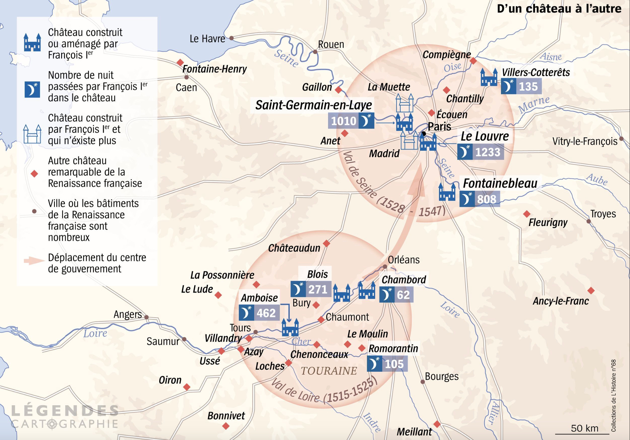 He was a great patron of the arts and architecture. Great map this showing his program of château construction and where he spent his nights.