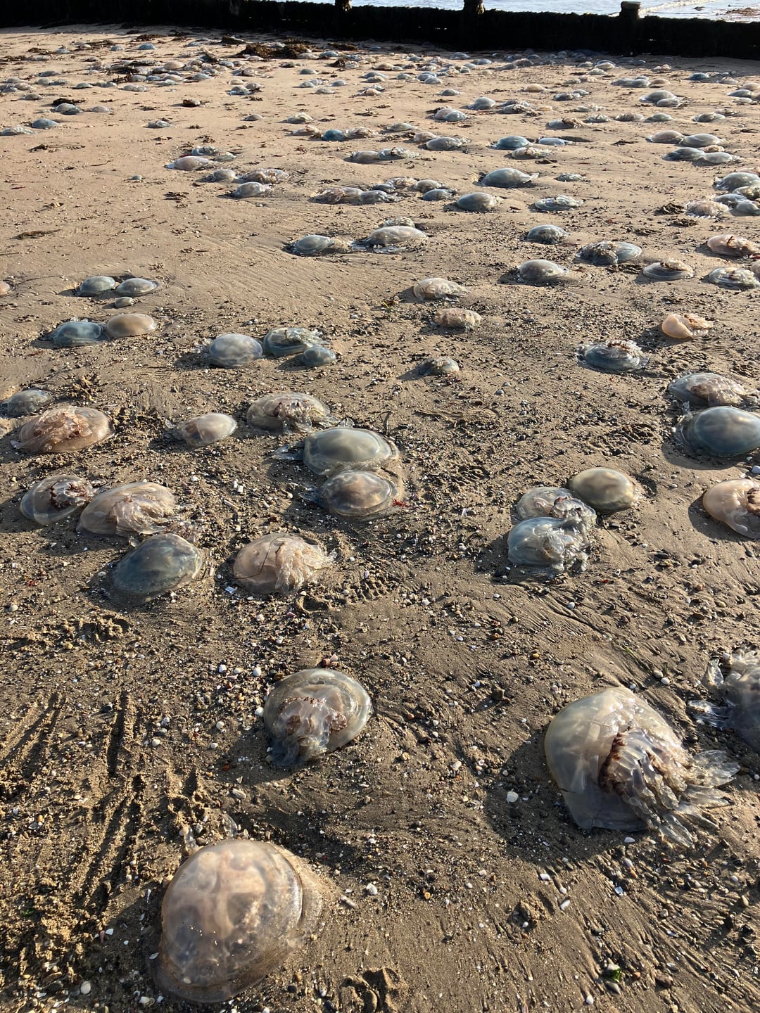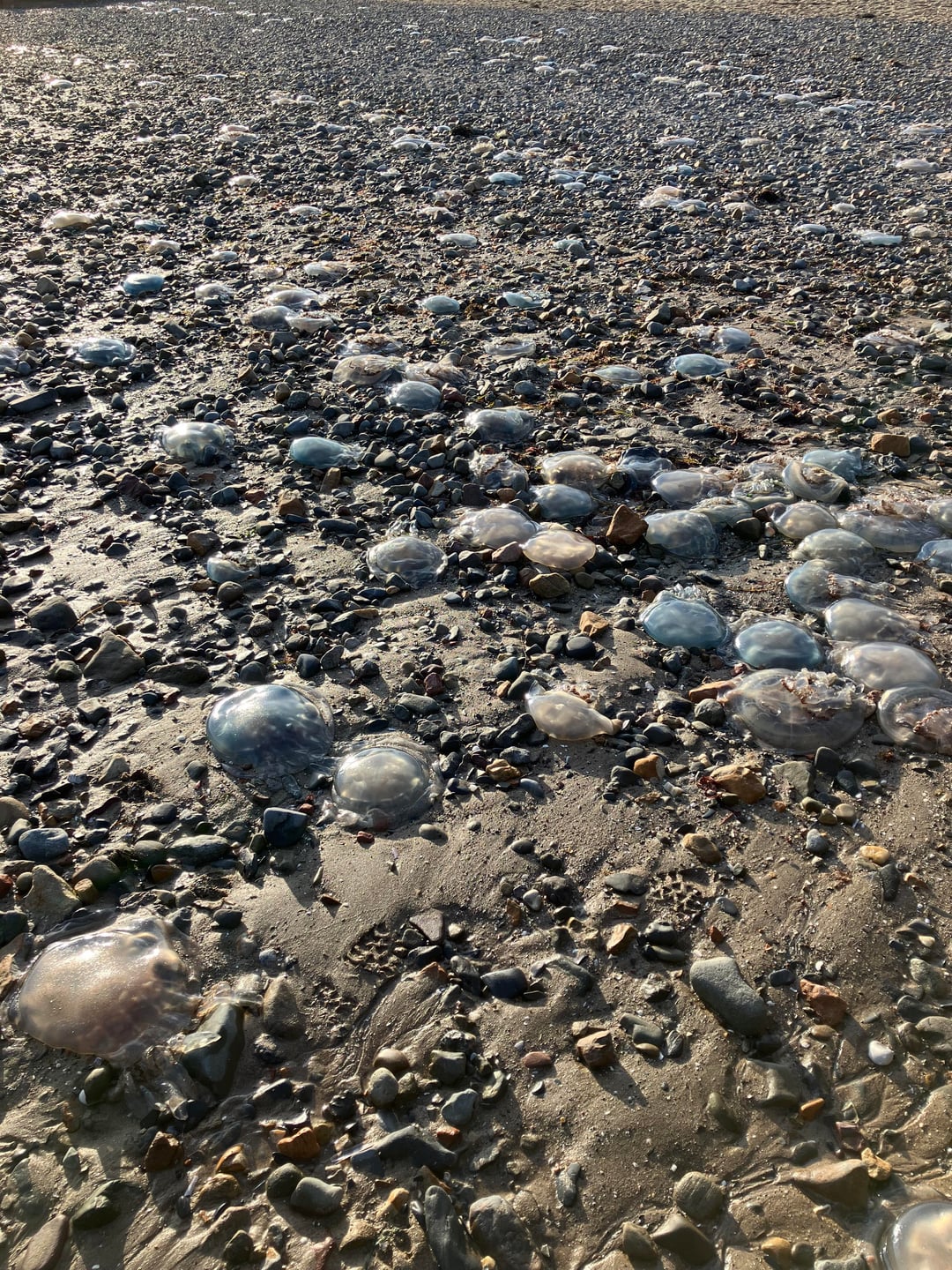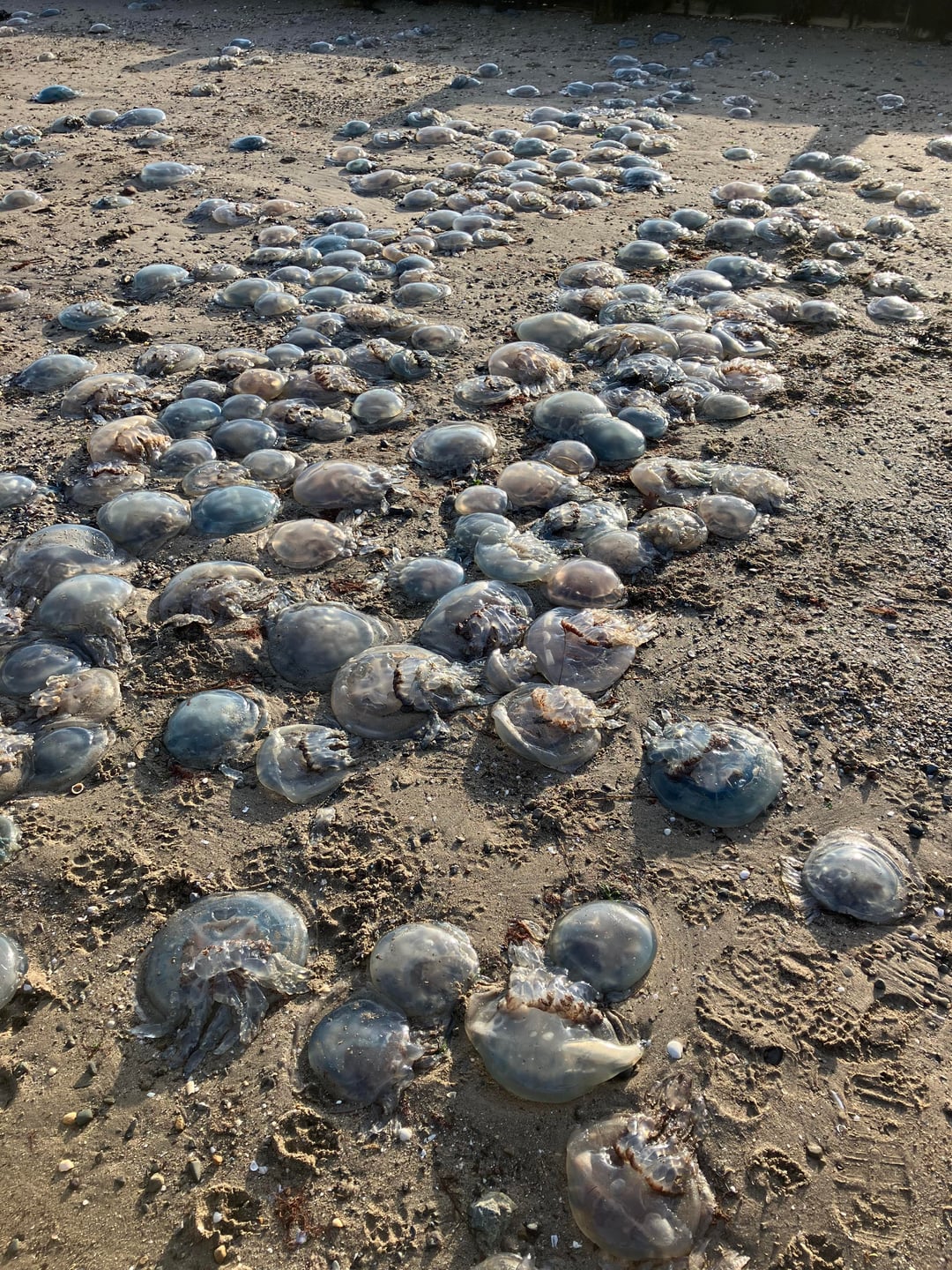 Most of them won’t survive long once they’re stranded like this, especially if the sun is out. It’s usually down to recent strong winds or tides pushing them toward the shore. Best to keep dogs away just in case they still have a bit of a sting left in them