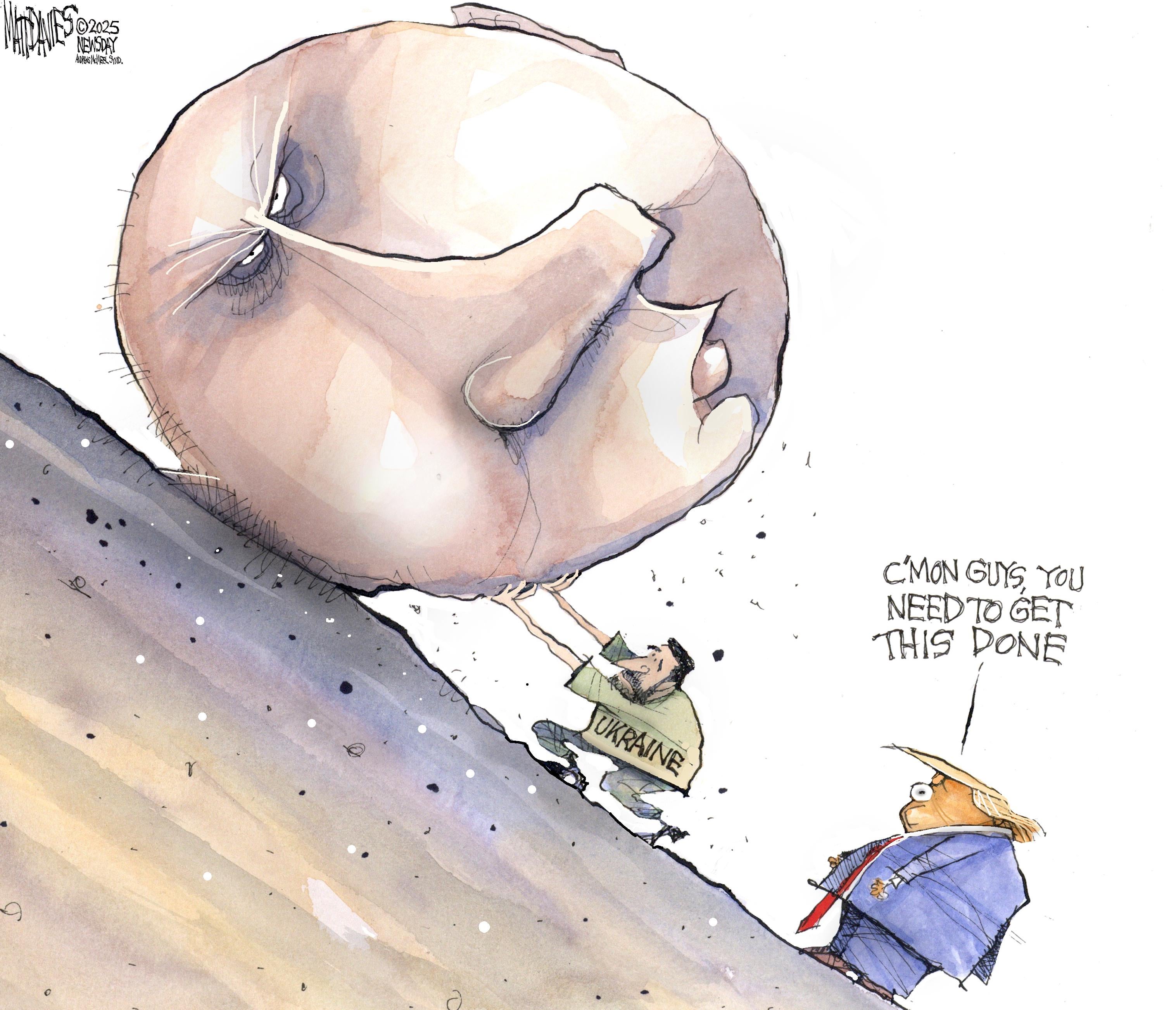 Not accurate. Trump is on top of the rock trying to balance on it, yelling for Ukraine to push harder while laughing.