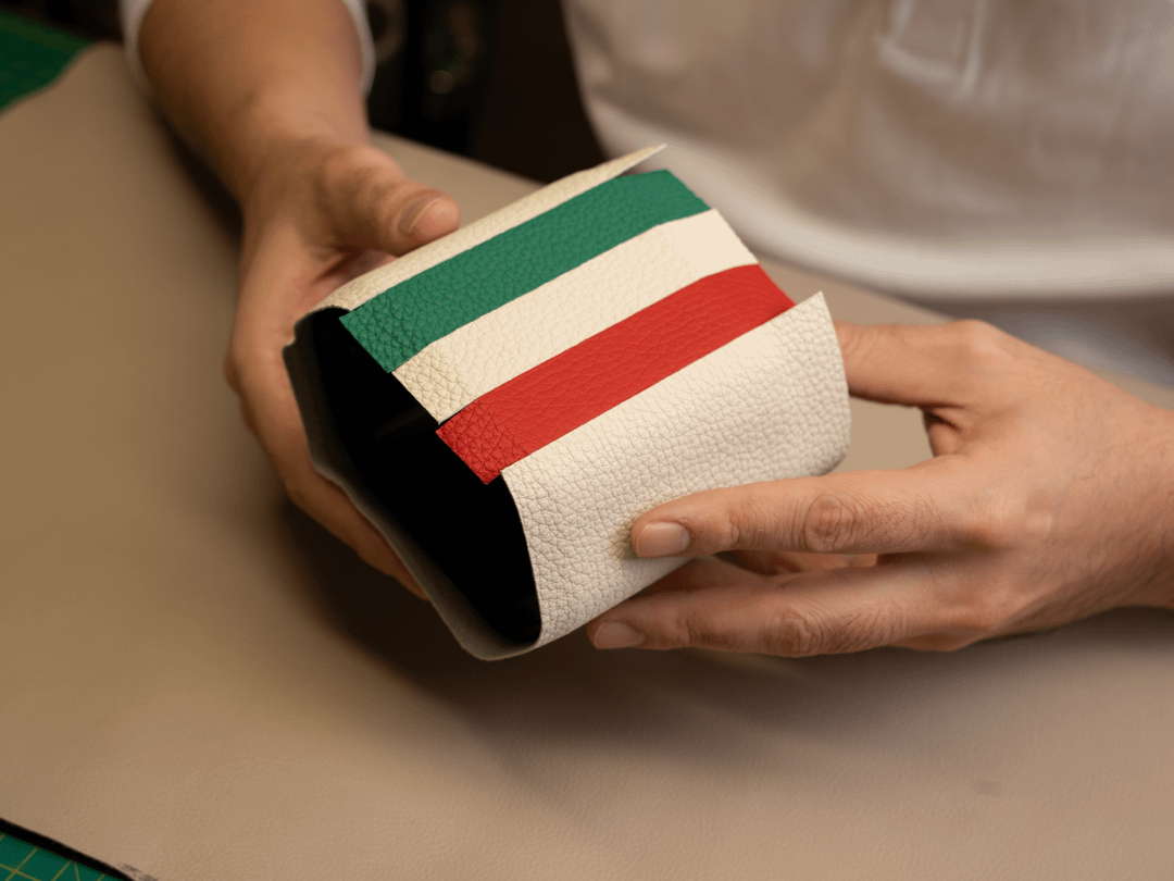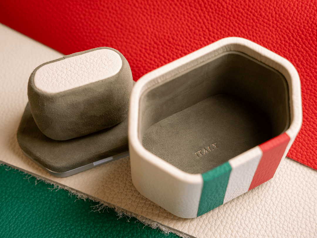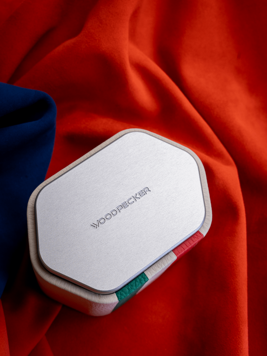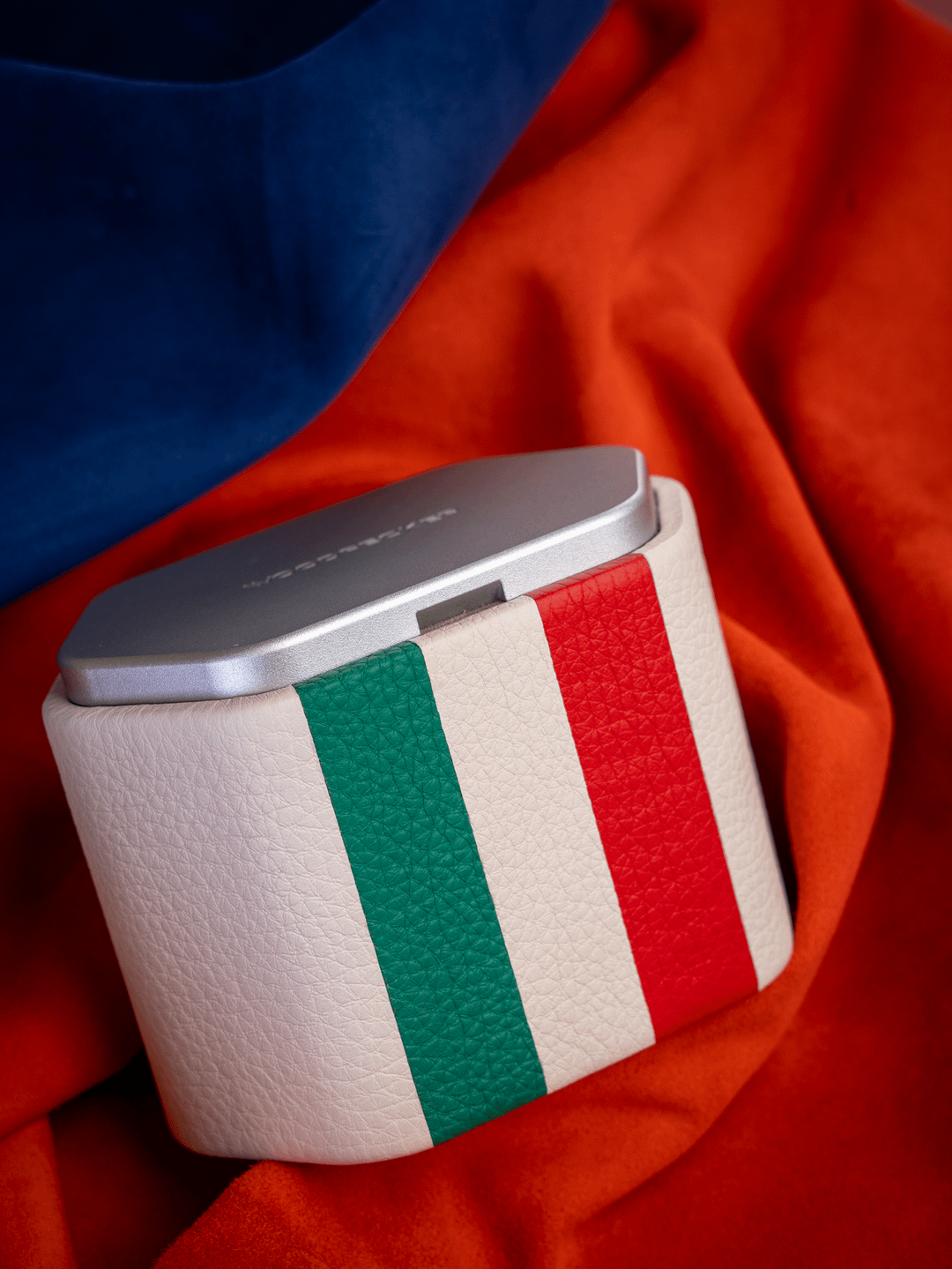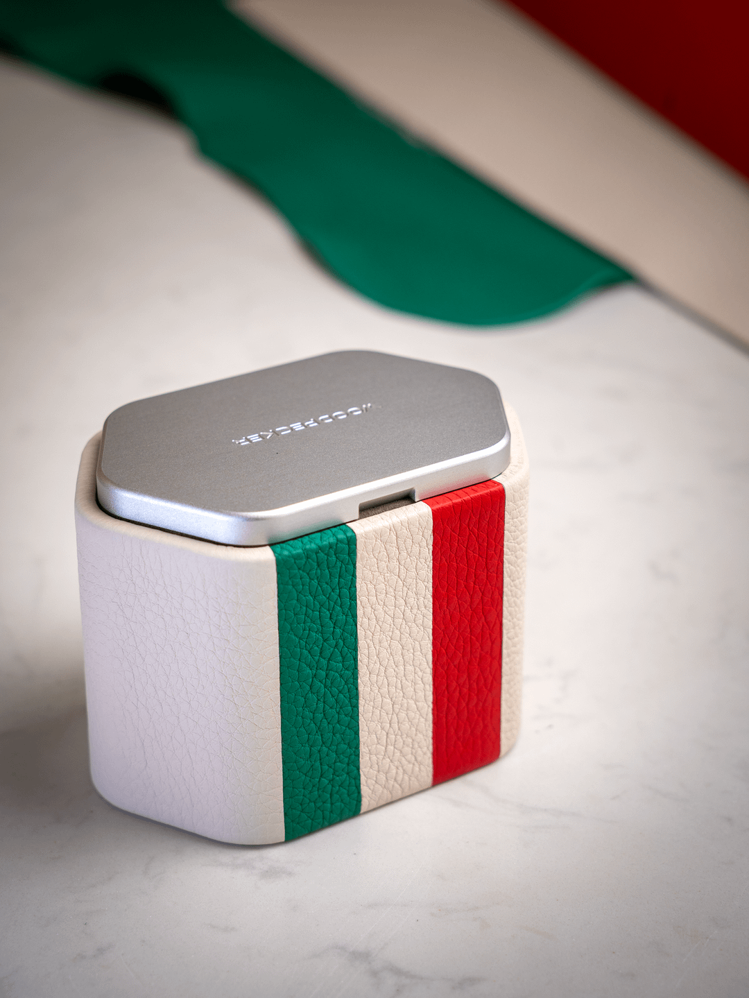Questa scatola è rivestita in pelle naturale, lavorata e assemblata a mano, con una struttura in alluminio per garantire solidità e protezione. La combinazione dei colori verde, bianco e rosso non ha uno scopo decorativo, ma vuole essere un omaggio rispettoso allo spirito creativo e alla tradizione artigianale italiana.