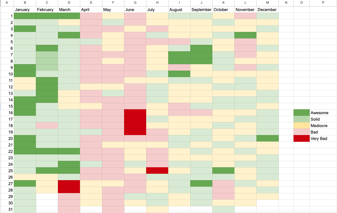 Thanks for this, this is the kinda thing that gets me through, being able to see visually that things improve over time and see the ups and downs. I’ve been doing similar by keeping track of my days in a journal but I live this idea with the colours much more