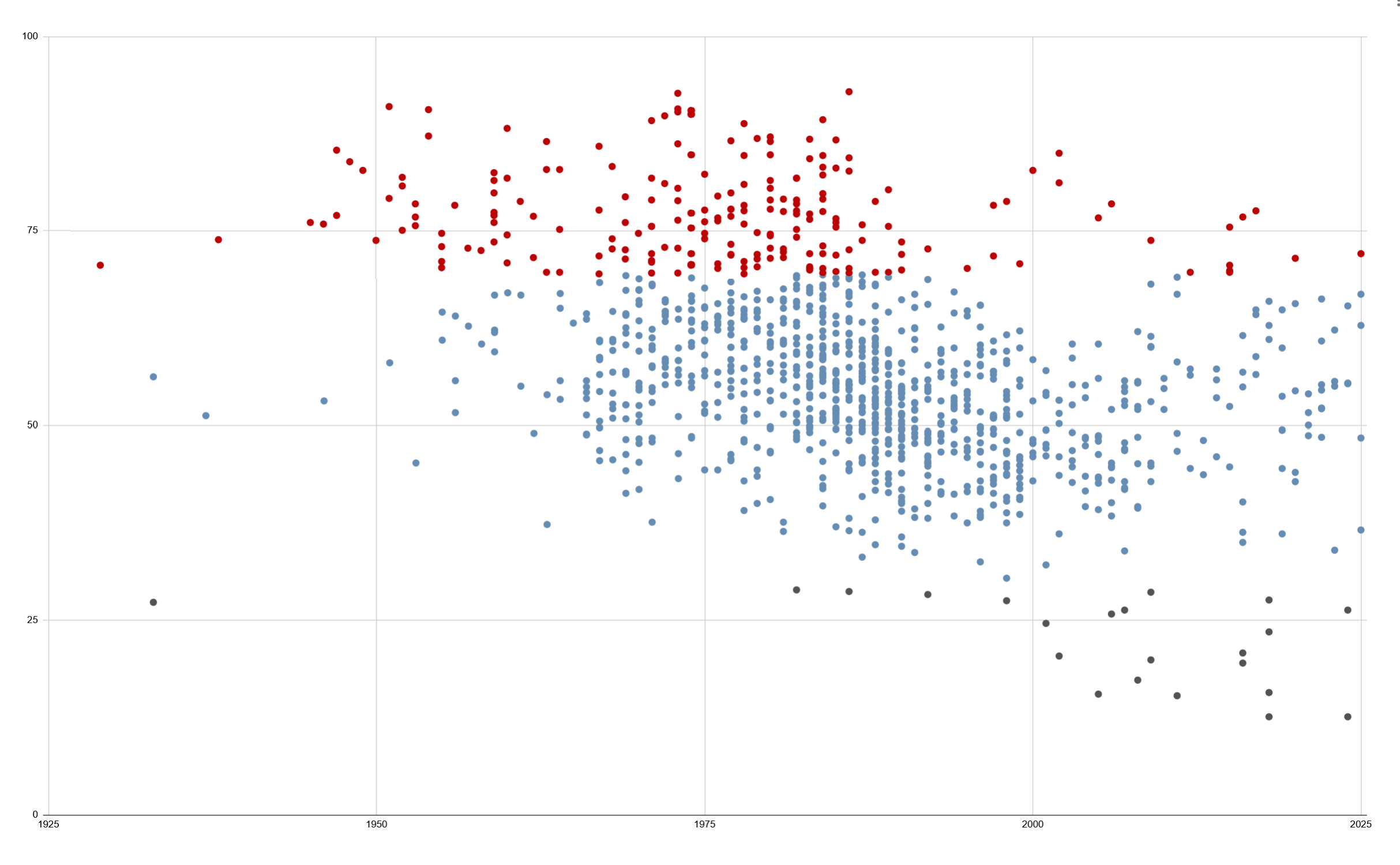 Máš tam i počet hodnocení? Tady na tom grafu je vidět, jak po vzniku ČSFD průměrné hodnocení najednou dost kleslo. Dřív totiž se na nějakou debilní pohádku zapomnělo, ale dneska ji hned všichni ohodnotí a až pak zapomenou.