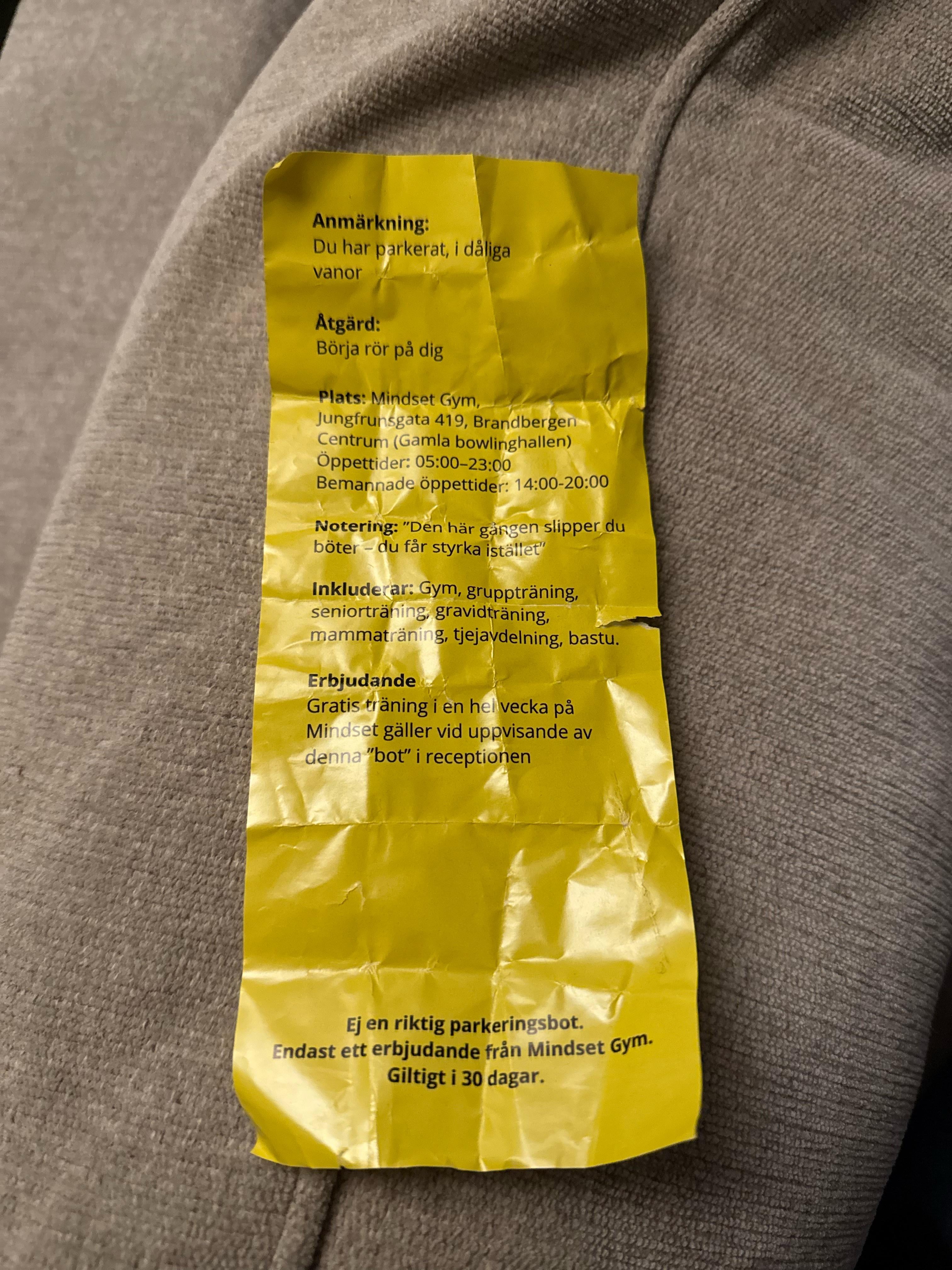 Kliver ut ur bilen och river loss denna lapp. Aldrig någonsin tidigare har jag varit mindre sugen på något. Detta blir en automatisk bojkott.