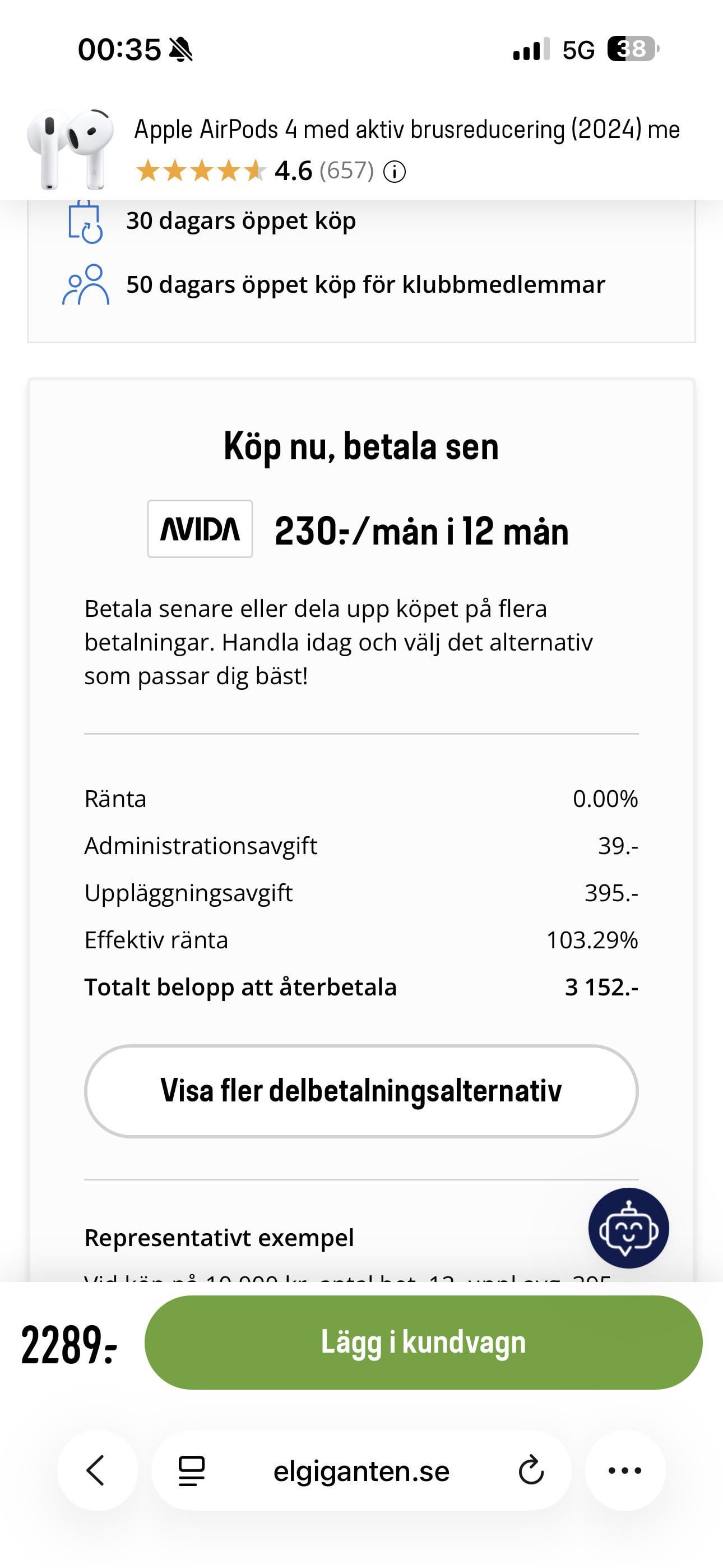 Hur blir den effektiva räntan 103%? De kostar 2289kr för dem med avbetalning ska du totalt betala 3152kr över ett år? Dvs, den effektiva räntan är typ 38%? Känns som något är skumt med procentsatsen som visas.