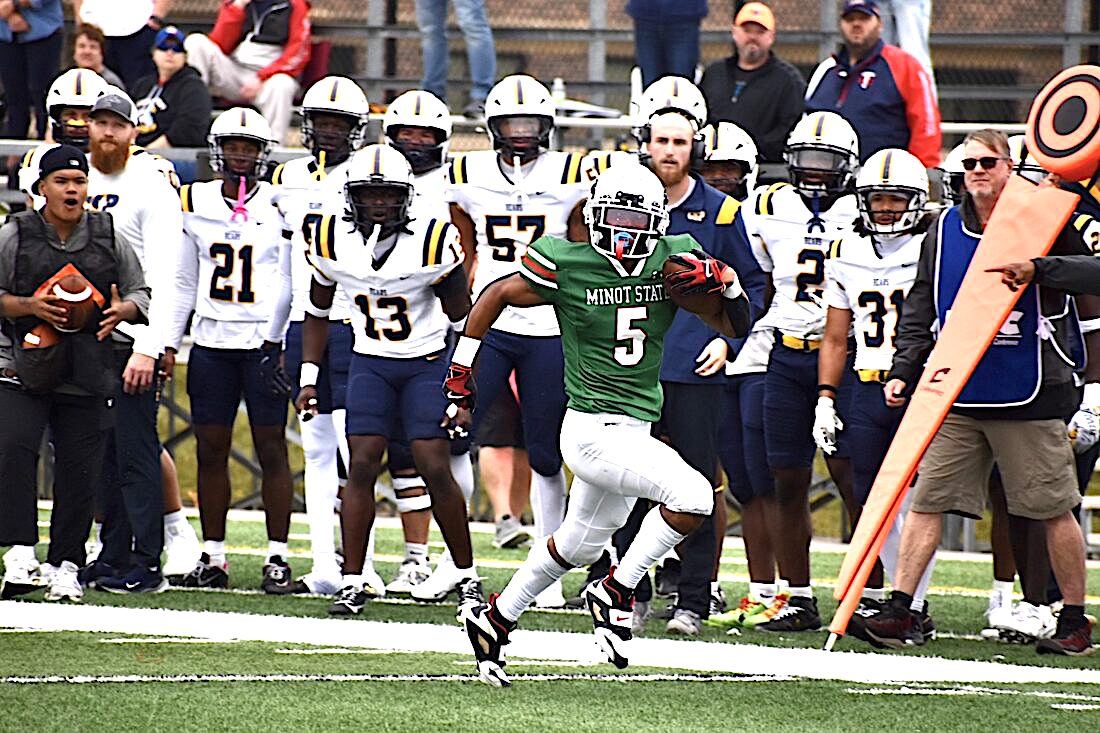 No. 2: Minot State sophomore Devan Daniels runs the ball down the field at Herb Parker Stadium at the Beavers’ homecoming game of the 100th season of football against Concordia-St. Paul. Photo by Nathan Beitler/MDN