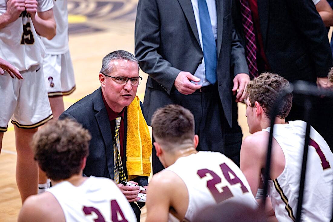 No. 7: Minot High head boys’ basketball coach Dean Winczewski addresses his team during a timeout during the Magicians’ game against Dickinson on Jan. 14. After 17 years at the helm, Winczewski stepped down as head coach of the program. Photo by Mason Kramer.