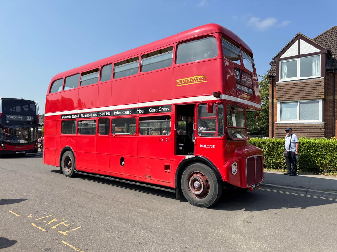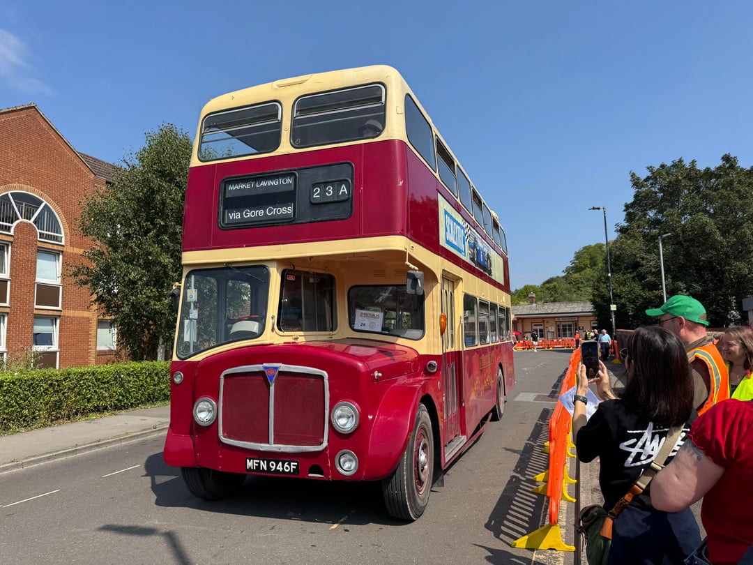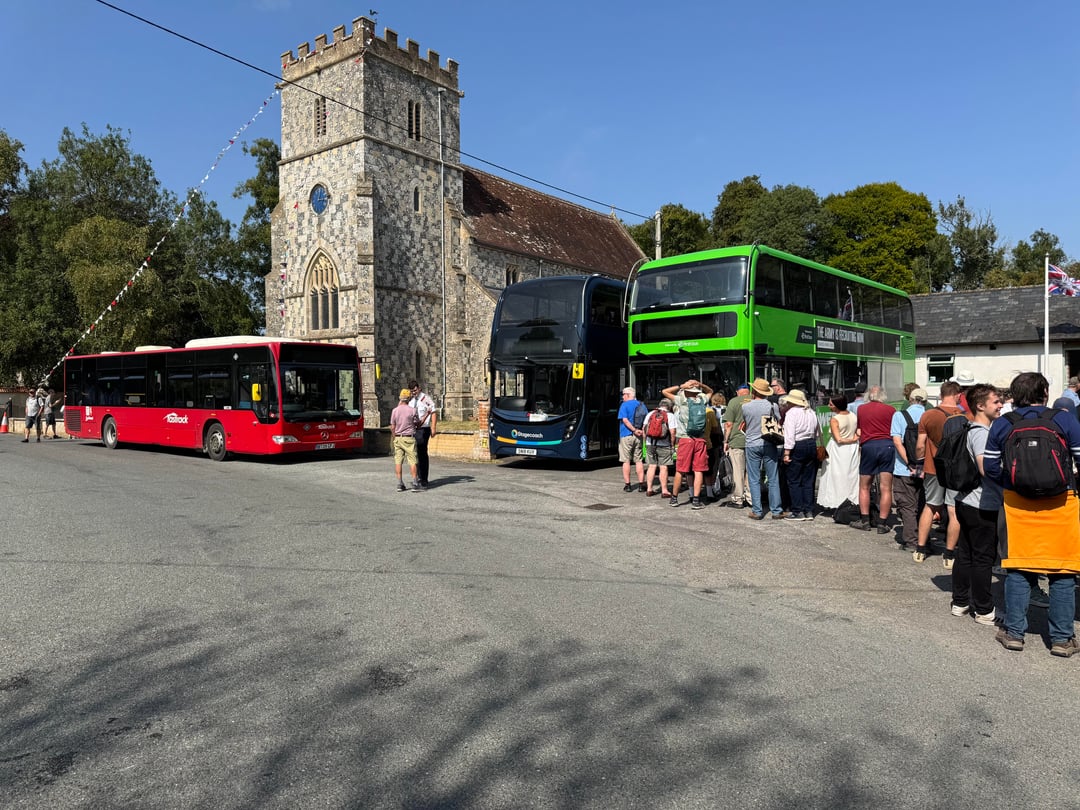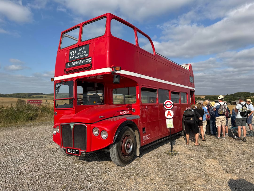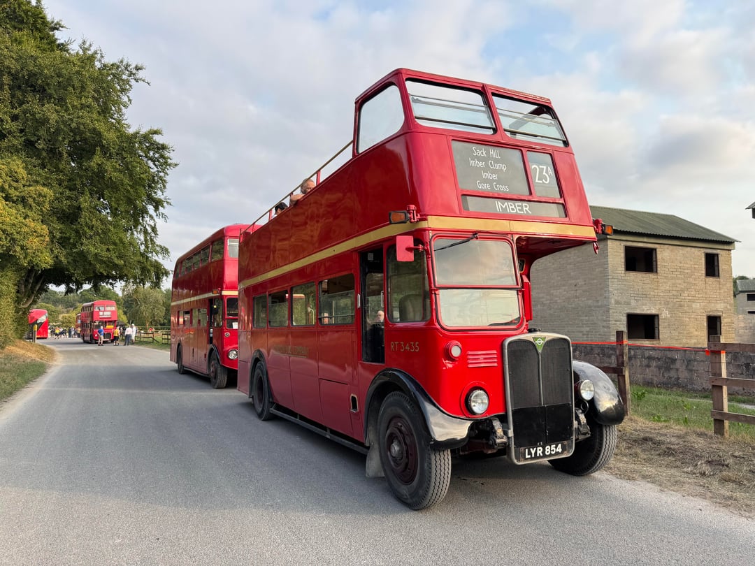 Up to 35 buses were in operation [1]. Most of these buses were heritage vehicles, such as the iconic Routemaster, but a few were modern wheelchair-accessible vehicles. A few non-London guest vehicles that had not visited Imber before were also present. Departures from Warminster station to Imber were approximately every 10-15 minutes from 09:30 onwards, with buses returning from Imber at regular intervals until 17:30 [1][2].