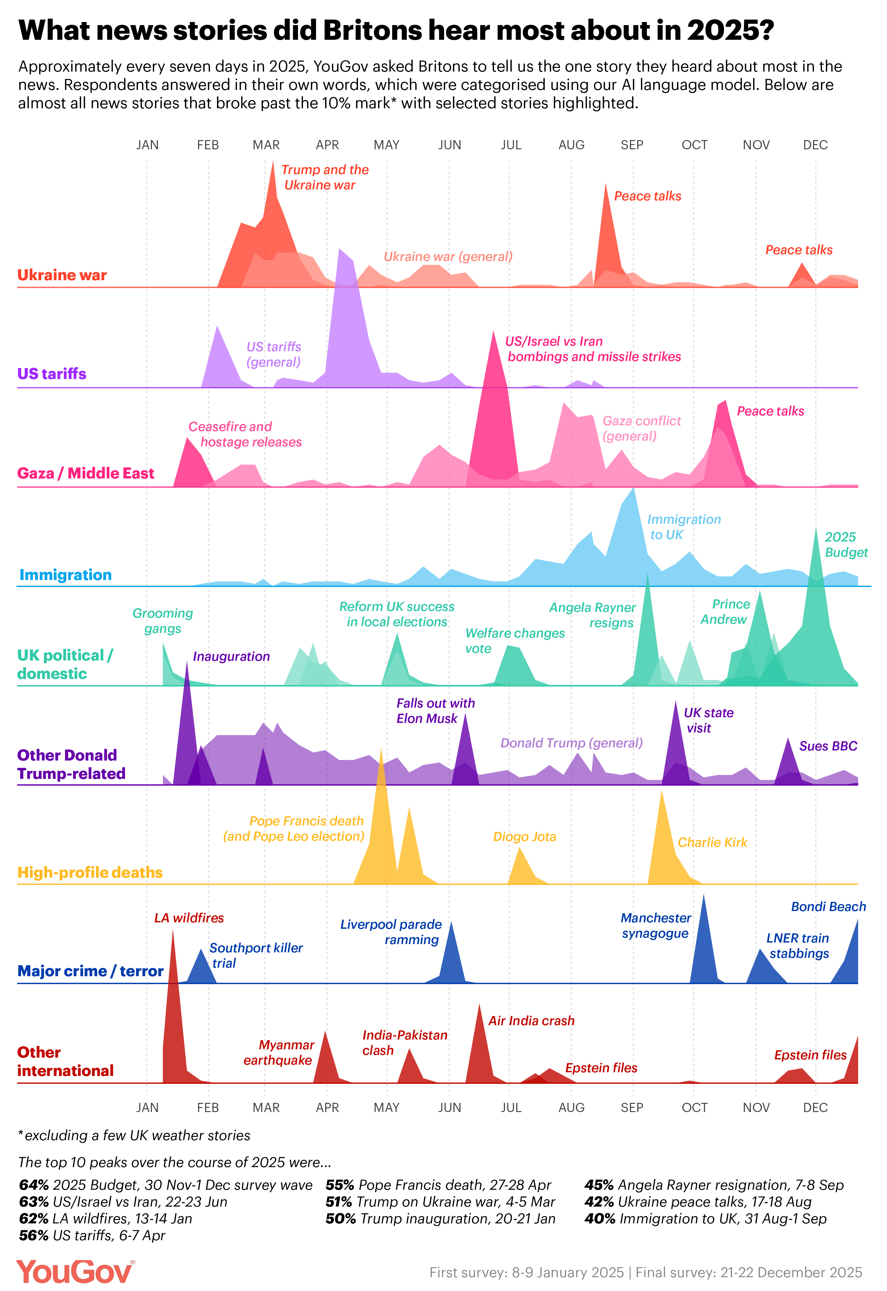 1. Over the course of 2025, approximately once a week we at YouGov asked the British public to tell us the single news story they had heard most about in recent days. As an end of year treat, I’ve compiled all of the results into the chart above.
