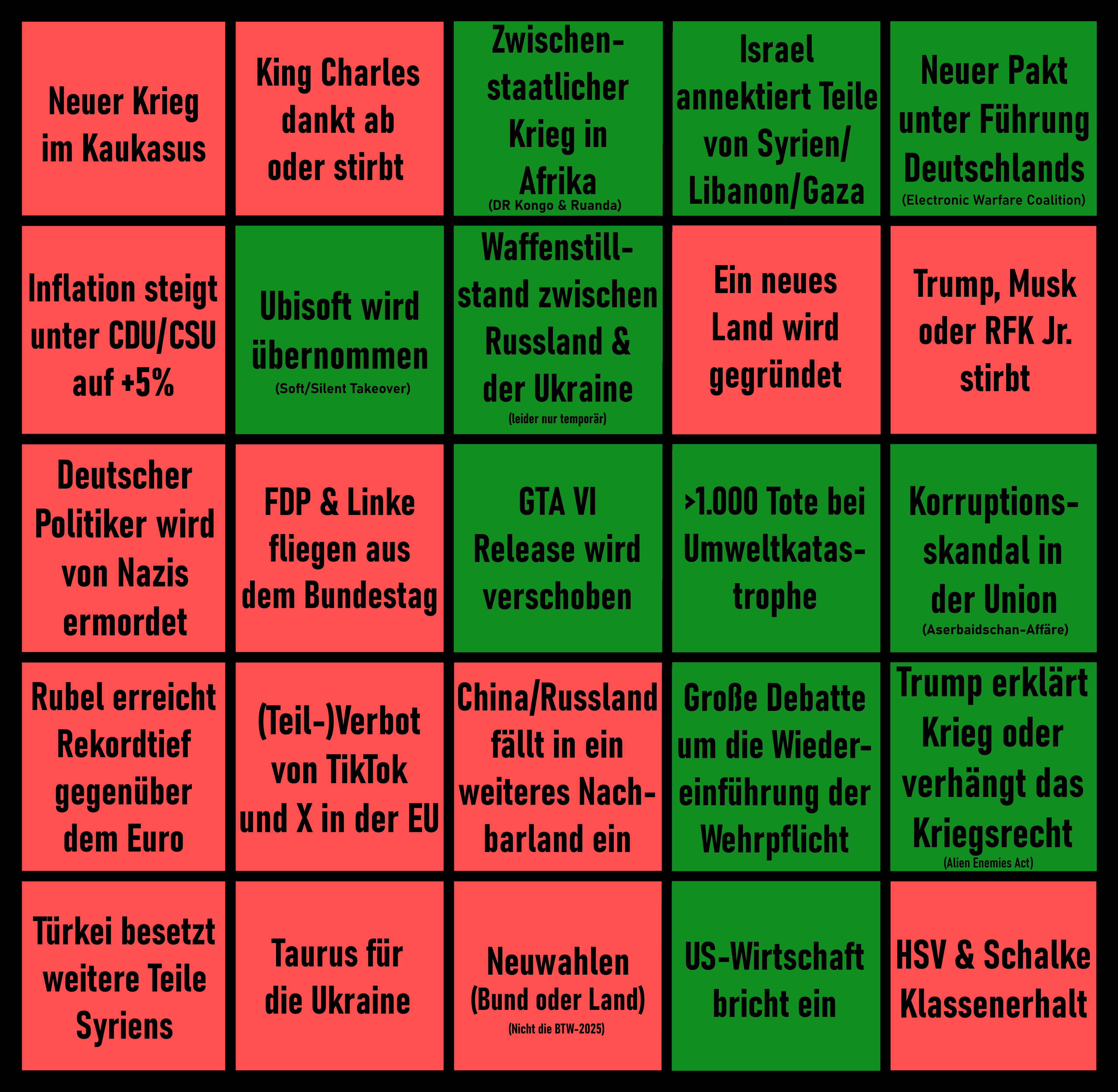 Ubisoft wurde nicht übernommen, kein waffenstillstand in der Ukraine den man auch als das bezeichnen konnte, US Wirtschaft ist nicht eingebrochen und die Aserbaidschan Affäre diesem Jahr zuzuordnen ist auch ein bisschen willkürlich, macht 7/25.