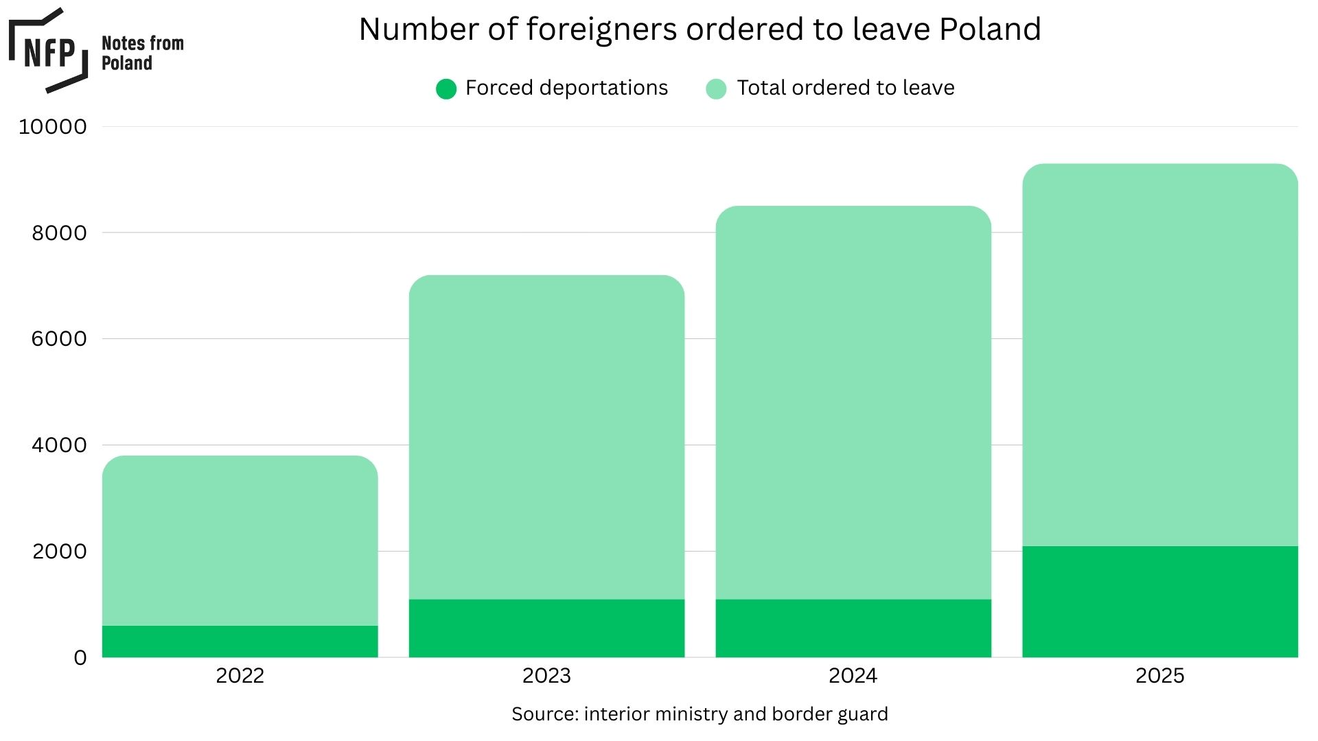 In total, just over 9,300 foreigners left Poland this year after being ordered to do so. That figure includes both forcible deportations and those who complied voluntarily. It was up from 8,700 in 2024, 7,200 in 2023, and 3,800 in 2022.