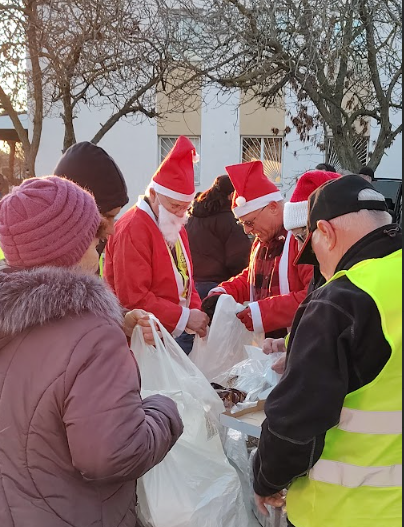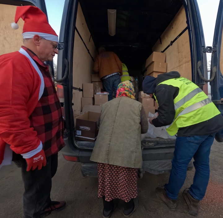 Santa and helpers filling bags with food in war-torn Ukraine.