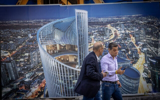 Illustrative: People walk by a poster displaying a spiral tower being built in Tel Aviv on November 17, 2025. (Miriam Alster/FLASH90)