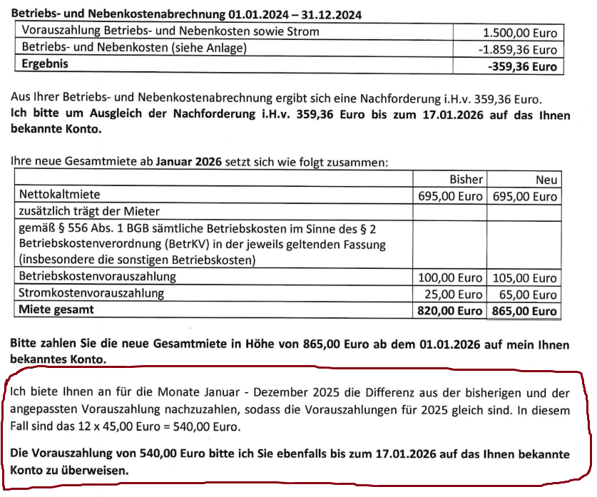 Based on that they adjusted the prepayment in particular for electricity (Vorauszahlung) for 2026. The rent (nettokaltmiete) stays the same.